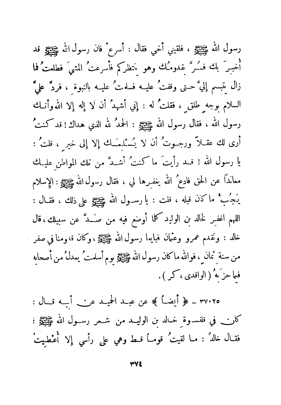 رسول الله صلى الله عليه وسلم، فلقيني أخي فقال: أسرع فإن رسول الله صلى الله عليه وسلم قد أخبر بك فسر بقدومك وهو ينتظركم فأسرعت المشي فطلعت فما زال يبتسم إلي حتى وقفت عليه فسلمت عليه بالنبوة، فرد علي السلام بوجه طلق. فقلت له: إني أشهد أن لا إله إلا الله وأنك رسول الله، فقال رسول الله صلى الله عليه وسلم: الحمد لله الذي هداك! قد كنت أرى لك عقلا ورجوت أن لا يسلمك إلا إلى خير، قلت: يا رسول الله! قد رأيت ما كنت أشد من تلك المواطن عليك معاندا عن الحق فادع الله يغفرها لي، فقال رسول الله صلى الله عليه وسلم: الإسلام يجب ما كان قبله، قلت: يا رسول الله صلى الله عليه وسلم على ذلك، فقال: اللهم اغفر لخالد بن الوليد كلما أوضع فيه من صد عن سبيلك، قال خالد: ونقدم عمرو وعثمان فبايعا رسول الله صلى الله عليه وسلم، وكان قدومنا في صفر من سنة ثمان، فوالله ما كان رسول الله صلى الله عليه وسلم يوم أسلمت يعدل من أصحابه فيما حزبه."الواقدي، كر".