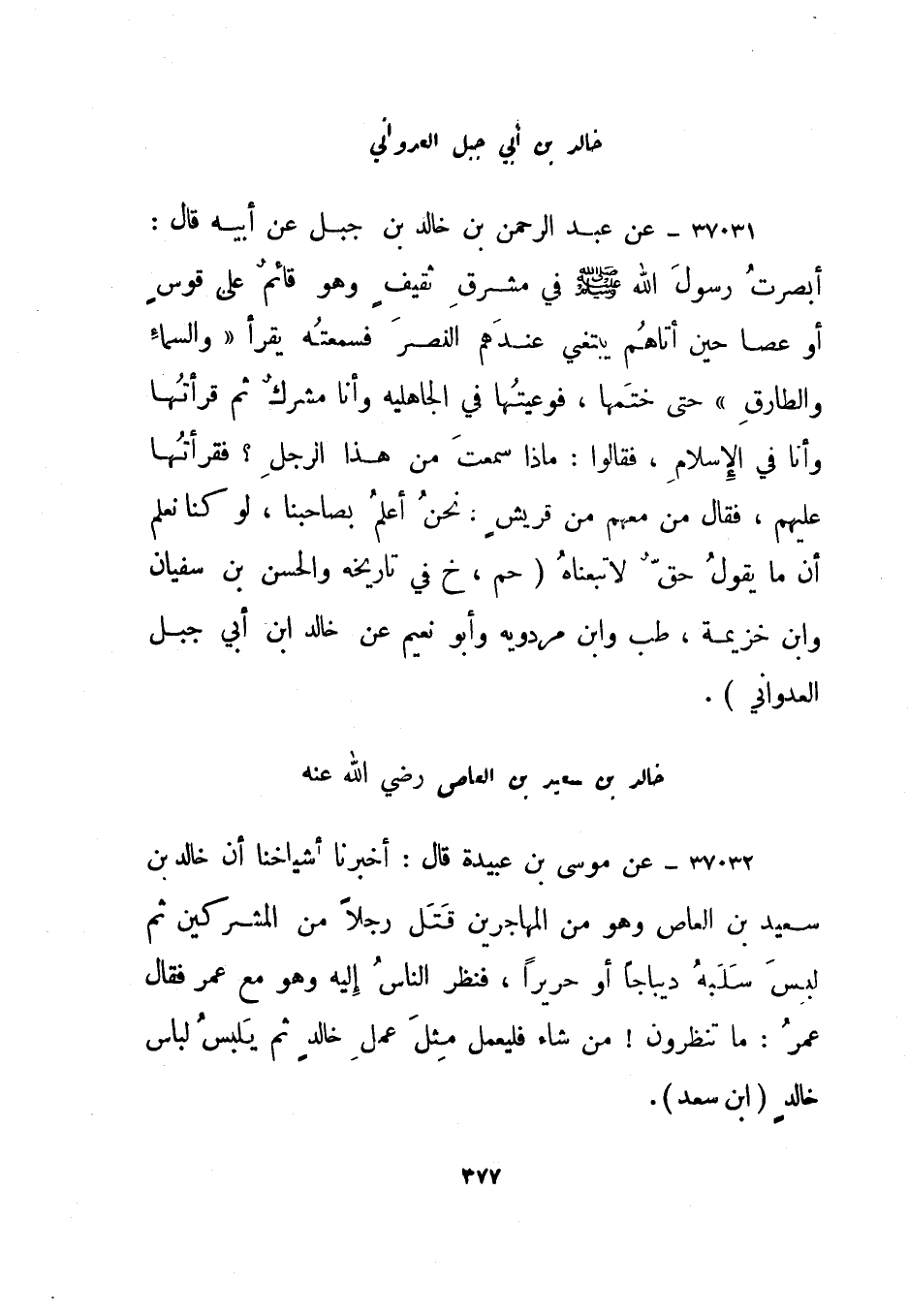 37031- عن عبد الرحمن بن خالد بن جبل عن أبيه قال: أبصرت رسول الله صلى الله عليه وسلم في مشرق ثقيف وهو قائم على قوس أو عصا حين أتاهم يبتغي عندهم النصر فسمعته يقرأ "والسماء والطارق" حتى ختمها، فوعيتها في الجاهلية وأنا مشرك ثم قرأتها وأنا في الإسلام، فقالوا: ماذا سمعت من هذا الرجل؟ فقرأتها عليهم، فقال من معهم من قريش: نحن أعلم بصاحبنا، لو كنا نعلم أن ما يقول حق لاتبعناه. "حم، خ" في تاريخه والحسن بن سفيان وابن خزيمة، "طب" وابن مردويه وأبو نعيم عن خالد بن أبي جبل العدواني".