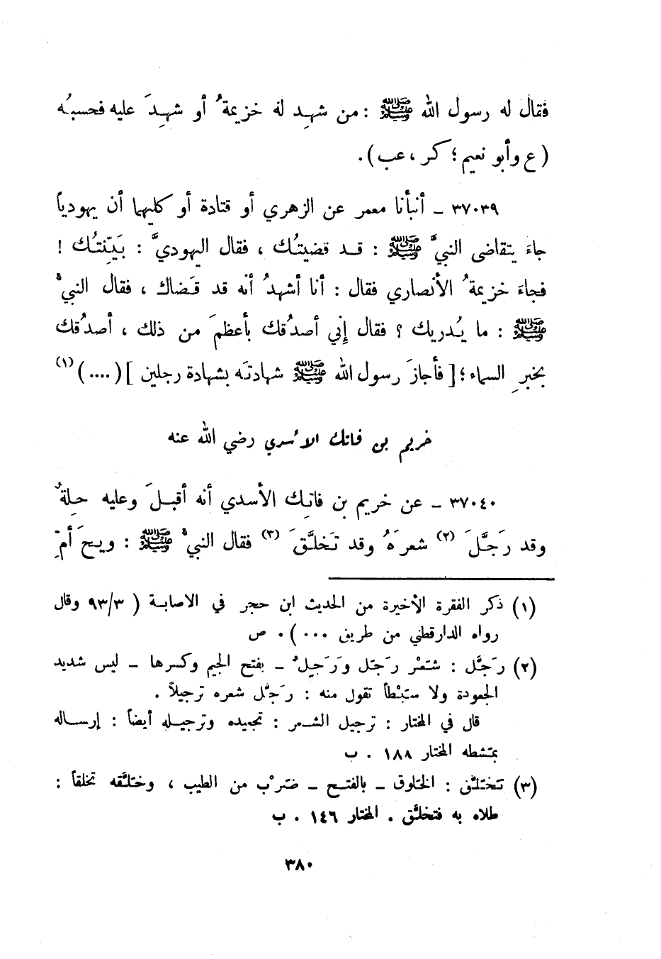 37040- عن خريم بن فاتك الأسدي أنه أقبل وعليه حلة وقد رجل2 شعره وقد تخلق3 فقال النبي صلى الله عليه وسلم: ويح أم