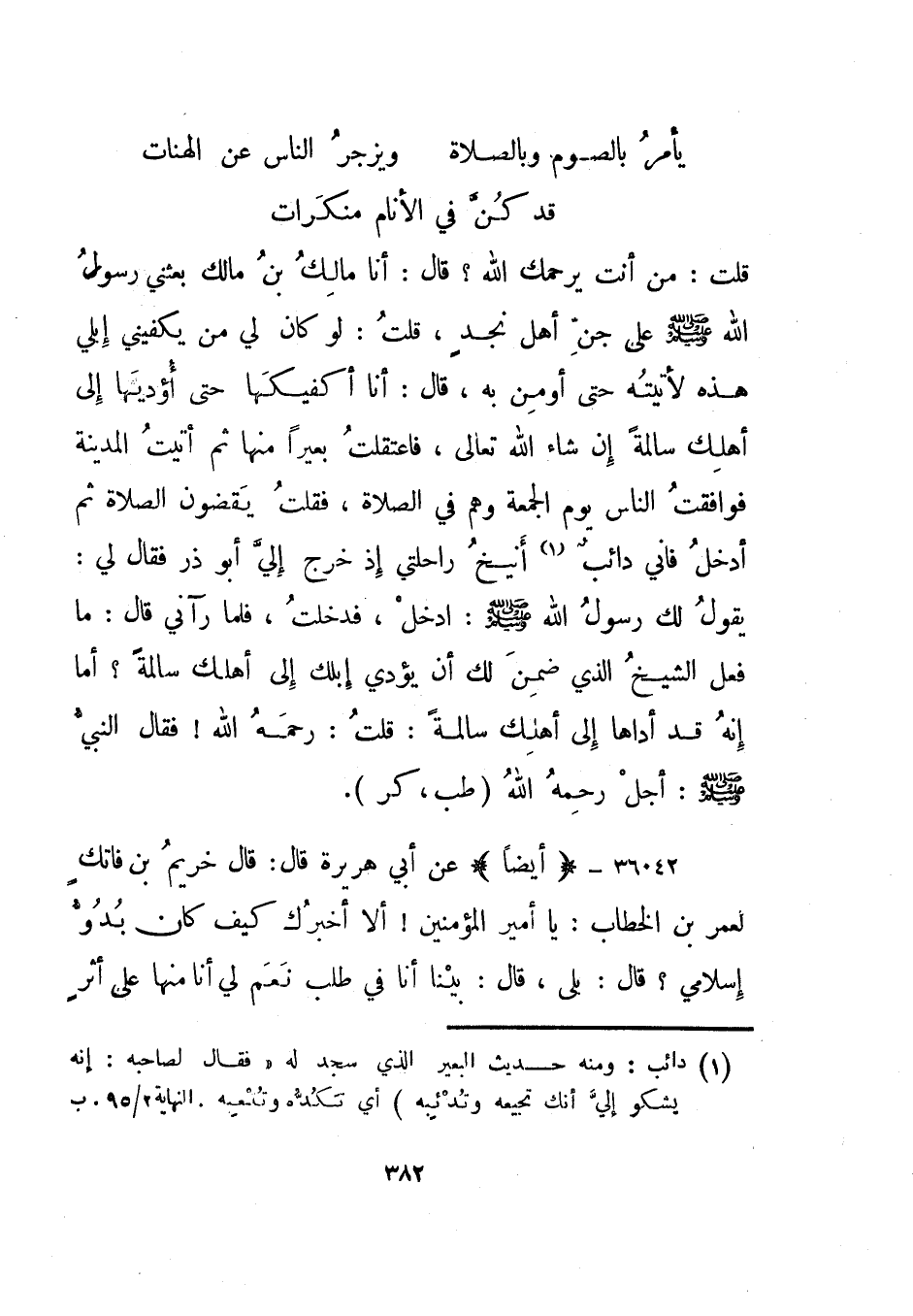 37042- "أيضا" عن أبي هريرة قال: قال خريم بن فاتك لعمر بن الخطاب: يا أمير المؤمنين! ألا أخبرك كيف كان بدو إسلامي؟ قال: بلى، قال: بينا أنا في طلب نعم لي أنا منها على أثر