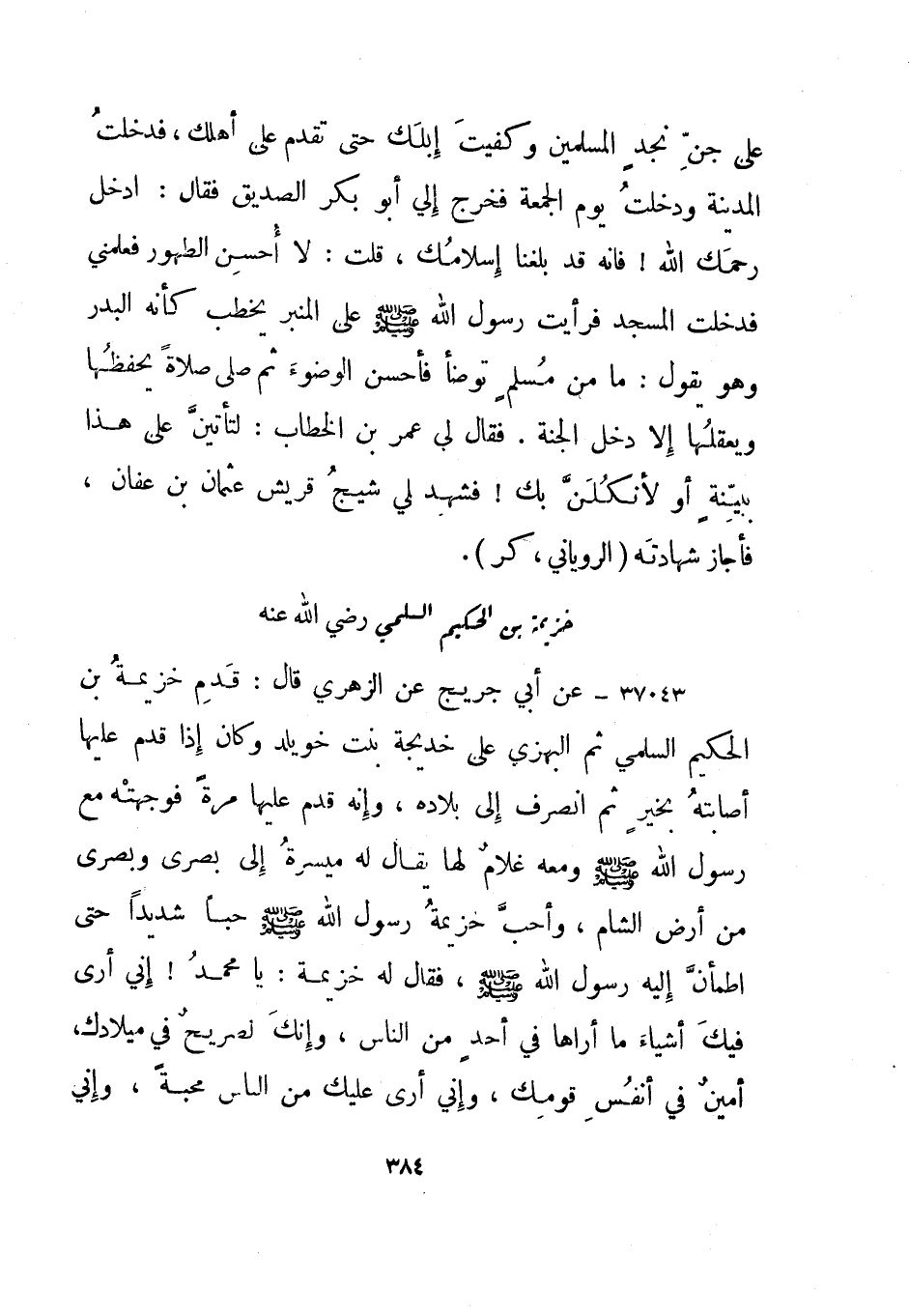 على جن نجد المسلمين وكفيت إبلك حتى تقدم على أهلك، فدخلت المدينة ودخلت يوم الجمعة فخرج إلي أبو بكر الصديق فقال: ادخل رحمك الله! فإنه قد بلغنا إسلامك، قلت: لا أحسن الطهور فعلمني فدخلت المسجد فرأيت رسول الله صلى الله عليه وسلم على المنبر يخطب كأنه البدر وهو يقول: ما من مسلم توضأ فأحسن الوضوء ثم صلى صلاة يحفظها ويعقلها إلا دخل الجنة. فقال لي عمر بن الخطاب: لتأتين على هذا ببينة أو لأنكلن بك! فشهد لي شيخ قريش عثمان بن عفان، فأجاز شهادته."الروياني، كر".