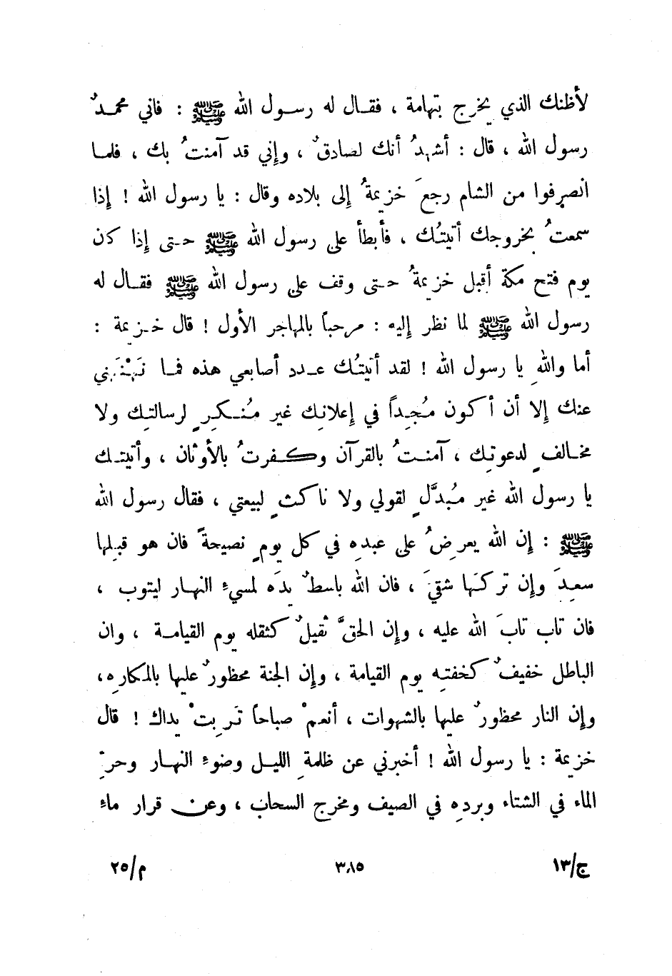 فقال رسول الله صلى الله عليه وسلم: إن الله يعرض على عبده في كل يوم نصيحة فإن هو قبلها سعد وإن تركها شقي، فإن الله باسط يده لمسيء النهار ليتوب، فإن تاب تاب الله عليه، وإن الحق ثقيل كثقله يوم القيامة، وإن الباطل خفيف كخفته يوم القيامة، وإن الجنة محظور عليها بالمكاره، وإن النار محظور عليها بالشهوات، أنعم صباحا تربت يداك! قال خزيمة: يا رسول الله! أخبرني عن ظلمة الليل وضوء النهار وحر الماء في الشتاء وبرده في الصيف ومخرج السحاب، وعن قرار ماء