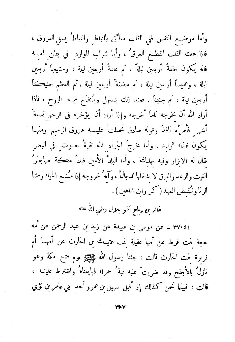 وأما موضع النفس ففي القلب معلق بالنياط والنياط يسقي العروق، فإذا هلك القلب انقطع العرق، وأما شراب المولود في بطن أمه فإنه يكون نطفة أربعين ليلة، ثم علقة أربعين ليلة، ومشيجا أربعين ليلة، وعميسا أربعين ليلة، ثم مضغة أربعين ليلة، ثم العظم حنيكا أربعين ليلة، ثم جنينا، فعند ذلك يستهل وينفخ فيه الروح، فإذا أراد الله أن يخرجه تاما أخرجه وإذا أراد أن يؤخره في الرحم تسعة أشهر فأمره نافذ وقوله صادق تحملت عليه عروق الرحم ومنها يكون غذاء الوليد، وأما مخرج الجراد فإنه نثرة حوت في البحر يقال له الابزار وفيه يهلك، وأما البلد الأمين فبلد مكة مهاجر الغيث والرعد والبرق لا يدخلها الدجال، وآية خروجه إذا منع الحياء وفشا الزنا ونقض العهد.