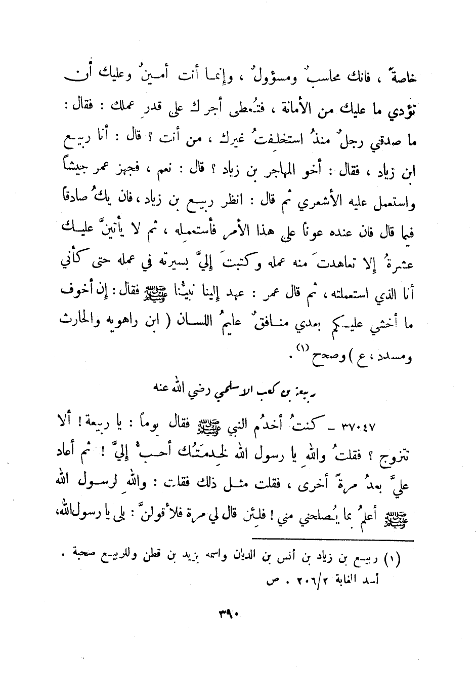37047- كنت أخدم النبي صلى الله عليه وسلم فقال يوما: يا ربيعة! ألا تتزوج؟ فقلت والله يا رسول الله لخدمتك أحب إلي! ثم أعاد علي بعد مرة أخرى، فقلت مثل ذلك فقلت: والله لرسول الله صلى الله عليه وسلم أعلم بما يصلحني مني! فلئن قال لي مرة فلأقولن: بلى يا رسول الله،