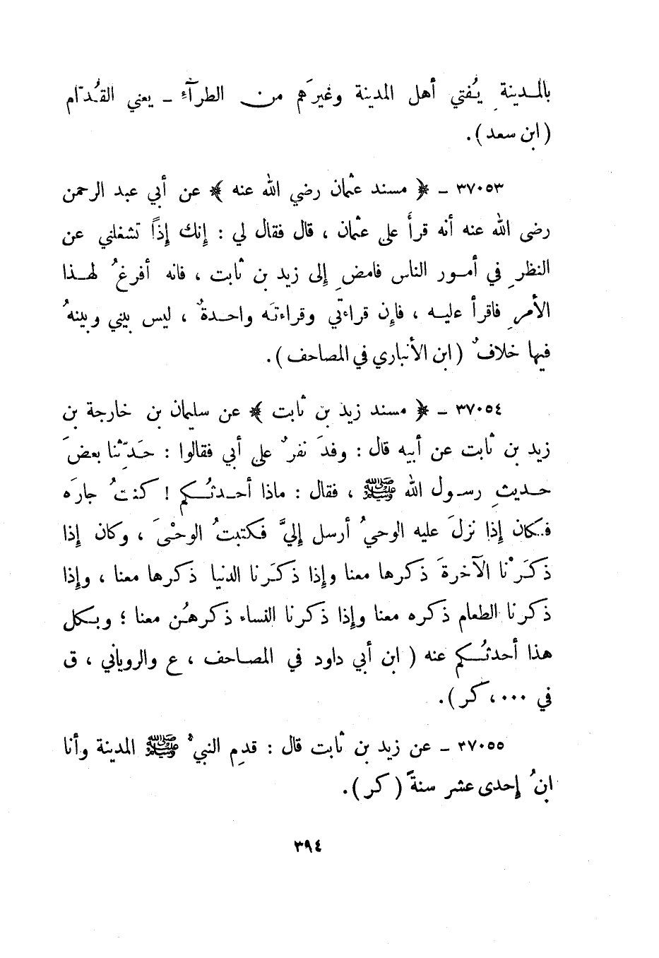 37053- "مسند عثمان رضي الله عنه" عن أبي عبد الرحمن رضي الله عنه أنه قرأ على عثمان، قال فقال لي: إنك إذا تشغلني عن النظر في أمور الناس فامض إلى زيد بن ثابت، فإنه أفرغ لهذا الأمر فاقرأ عليه، فإن قراءتي وقراءته واحدة، ليس بيني وبينه فيها خلاف."ابن الأنباري في المصاحف".