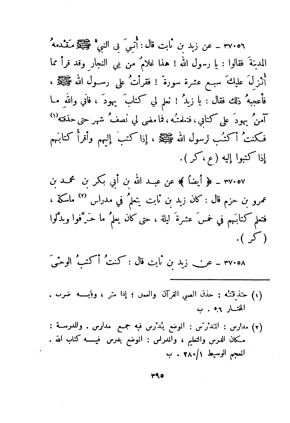 37057- "أيضا" عن عبد الله بن أبي بكر بن محمد بن عمرو بن حزم قال: كان زيد بن ثابت يتعلم في مدارس2 ماسكة، فتعلم كتابهم في خمس عشرة ليلة، حتى كان يعلم ما حرفوا وبدلوا. "كر".