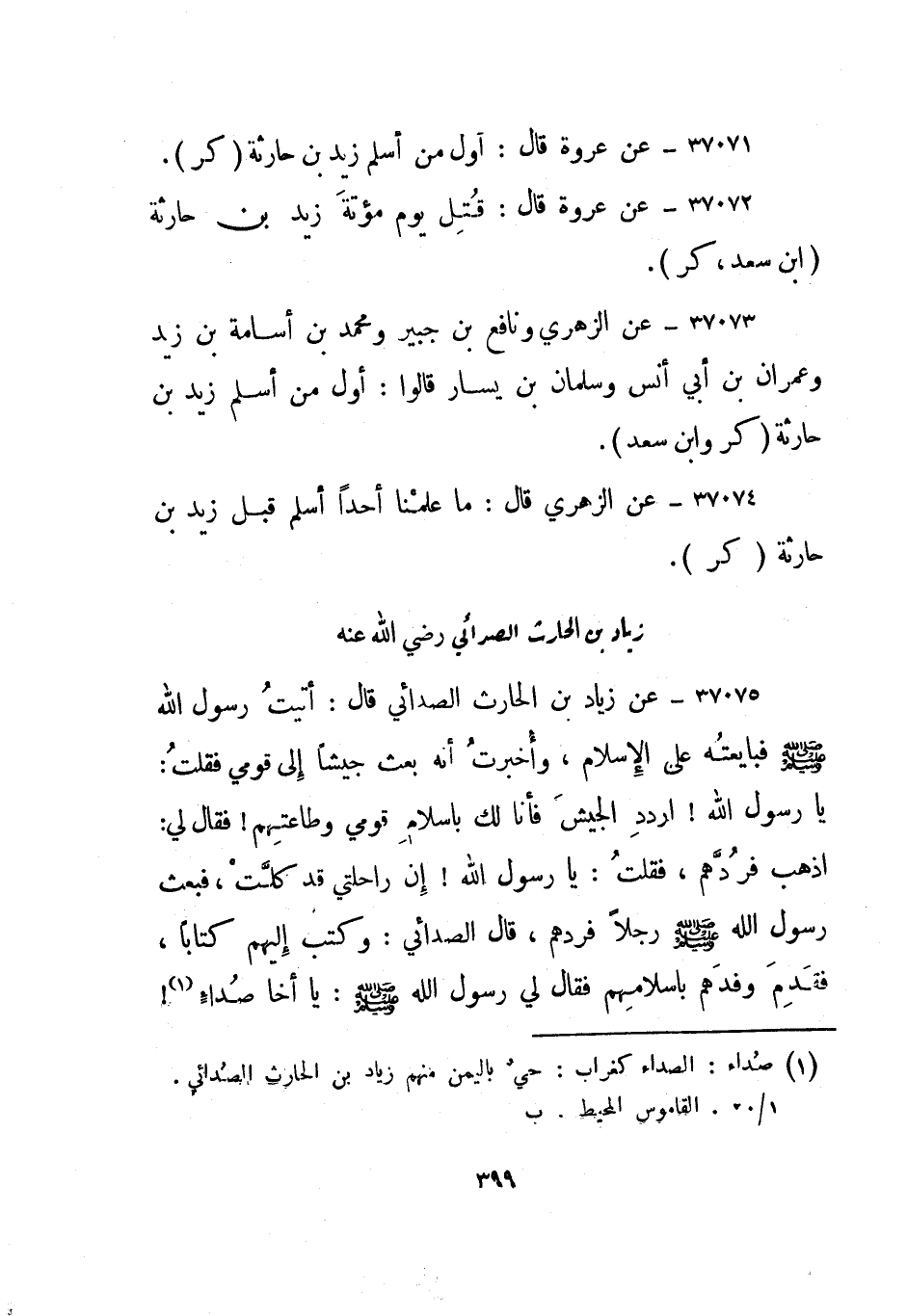 37075- عن زياد بن الحارث الصدائي قال: أتيت رسول الله صلى الله عليه وسلم فبايعته على الإسلام، وأخبرت أنه بعث جيشا إلى قومي فقلت: يا رسول الله! اردد الجيش فأنا لك بإسلام قومي وطاعتهم! فقال لي: اذهب فردهم، فقلت: يا رسول الله! إن راحلتي قد كلت، فبعث رسول الله صلى الله عليه وسلم رجلا فردهم، قال الصدائي: وكتب إليهم كتابا، فقدم وفدهم بإسلامهم فقال لي رسول الله صلى الله عليه وسلم: يا أخا صداء1!