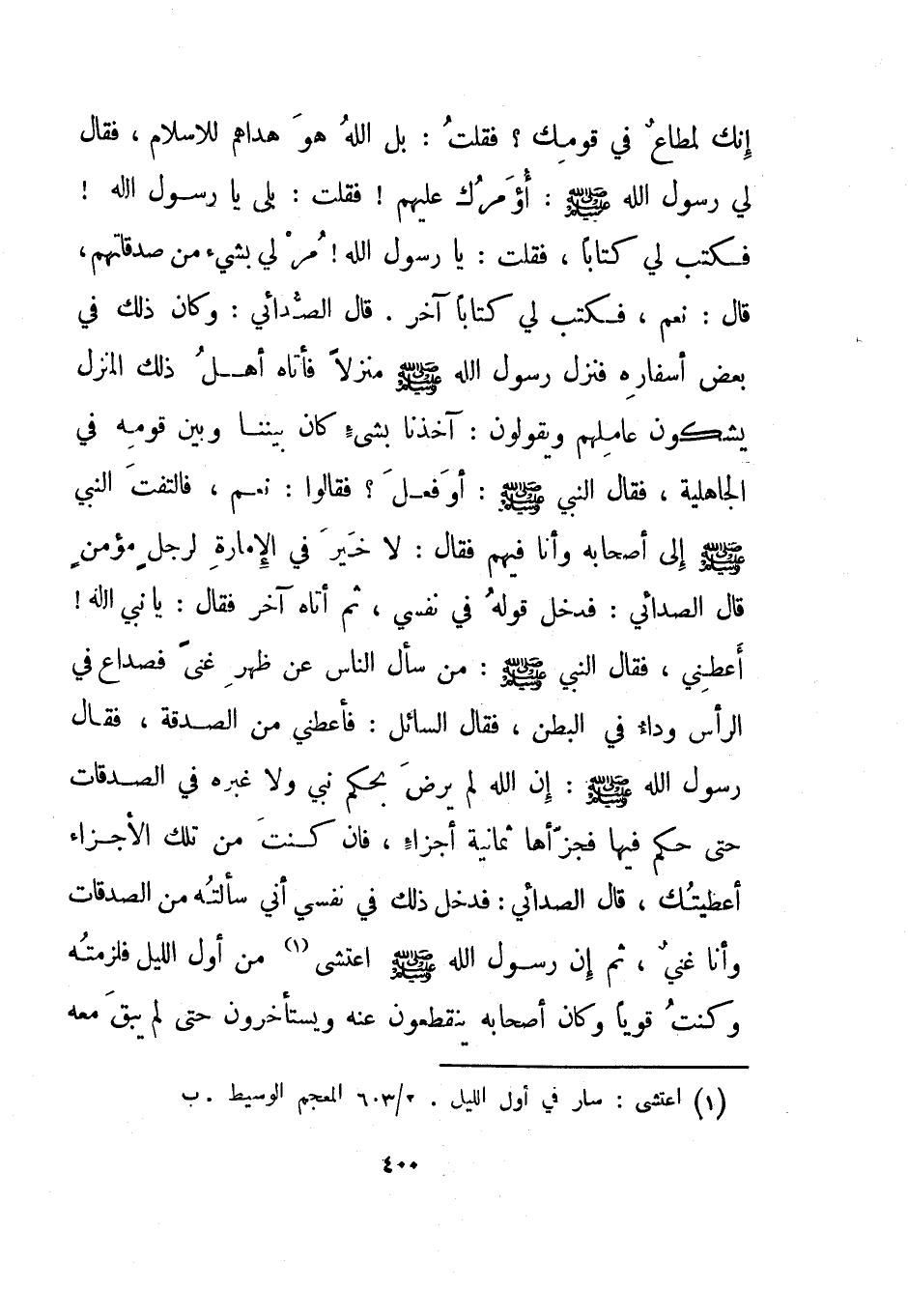 إنك لمطاع في قومك؟ فقلت: بل الله هو هداهم للإسلام، فقال لي رسول الله صلى الله عليه وسلم: أؤمرك عليهم! فقلت: بلى يا رسول الله! فكتب لي كتابا، فقلت: يا رسول الله! مر لي بشيء من صدقاتهم، قال: نعم، فكتب لي كتابا آخر. قال الصدائي: وكان ذلك في بعض أسفاره فنزل رسول الله صلى الله عليه وسلم منزلا فأتاه أهل ذلك المنزل يشكون عاملهم ويقولون: آخذنا بشيء كان بيننا وبين قومه في الجاهلية، فقال النبي صلى الله عليه وسلم: أو فعل؟ فقالوا: نعم. فالتفت النبي صلى الله عليه وسلم إلى أصحابه وأنا فيهم فقال: لا خير في الإمارة لرجل مؤمن قال الصدائي: فدخل قوله في نفسي، ثم أتاه آخر فقال: يا نبي الله! أعطني، فقال النبي صلى الله عليه وسلم: من سأل الناس عن ظهر غنى فصداع في الرأس وداء في البطن، فقال السائل: فأعطني من الصدقة، فقال رسول الله صلى الله عليه وسلم: إن الله لم يرض بحكم نبي ولا غيره في الصدقات حتى حكم فيها فجزأها ثمانية أجزاء، فإن كنت من تلك الأجزاء أعطيتك، قال الصدائي: فدخل ذلك في نفسي أني سألته من الصدقات وأنا غني، ثم إن رسول الله صلى الله عليه وسلم اعتشى1 من أول الليل فلزمته وكنت قويا وكان أصحابه ينقطعون عنه ويستأخرون حتى لم يبق معه