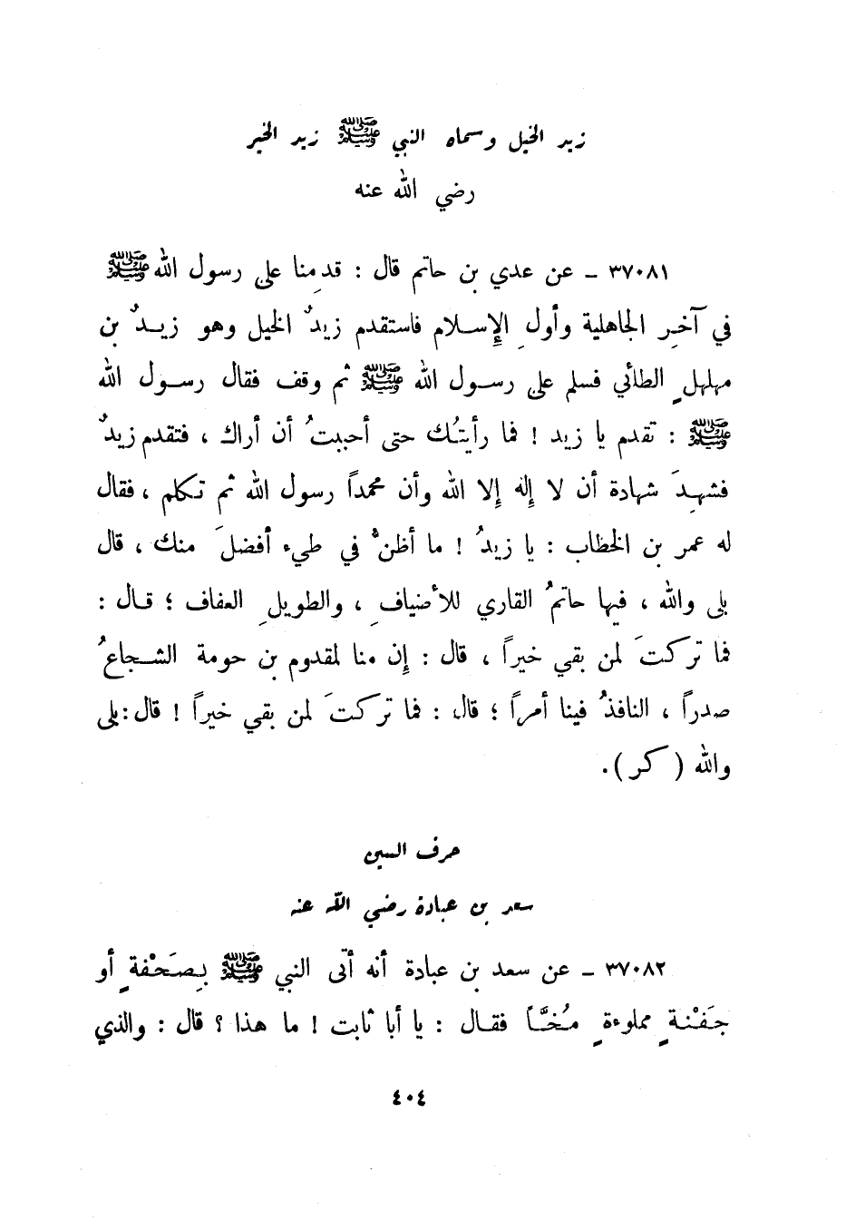 37081- عن عدي بن حاتم قال: قدمنا على رسول الله صلى الله عليه وسلم في آخر الجاهلية وأول الإسلام فاستقدم زيد الخيل وهو زيد بن مهلهل الطائي فسلم على رسول الله صلى الله عليه وسلم ثم وقف فقال رسول الله صلى الله عليه وسلم: تقدم يا زيد! فما رأيتك حتى أحببت أن أراك، فتقدم زيد فشهد شهادة أن لا إله إلا الله وأن محمدا رسول الله ثم تكلم، فقال له عمر بن الخطاب: يا زيد! ما أظن في طيء أفضل منك، قال بلى والله، فيها حاتم القاري للأضياف، والطويل العفاف؛ قال: فما تركت لمن بقي خيرا، قال: إن منا لمقدوم بن حومة الشجاع صدرا، النافذ فينا أمرا؛ قال: فما تركت لمن بقي خيرا! قال: بلى والله. "كر".