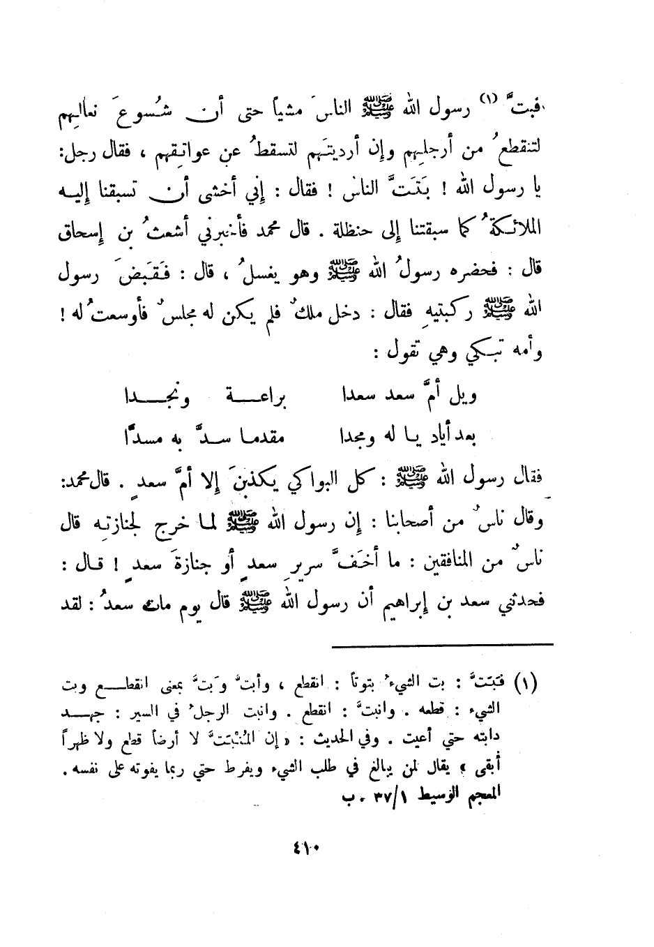 فبت1 رسول الله صلى الله عليه وسلم الناس مشيا حتى أن شسوع نعالهم لتنقطع من أرجلهم وإن أرديتهم لتسقط عن عواتقهم، فقال رجل: يا رسول الله! بتت الناس! فقال: إني أخشى أن تسبقنا إليه الملائكة كما سبقتنا إلى حنظلة. قال محمد فأخبرني أشعث بن إسحاق قال: فحضره رسول الله صلى الله عليه وسلم وهو يغسل، قال: فقبض رسول الله صلى الله عليه وسلم ركبتيه فقال: دخل ملك فلم يكن له مجلس فأوسعت له! ّوأمه تبكي وهي تقول: