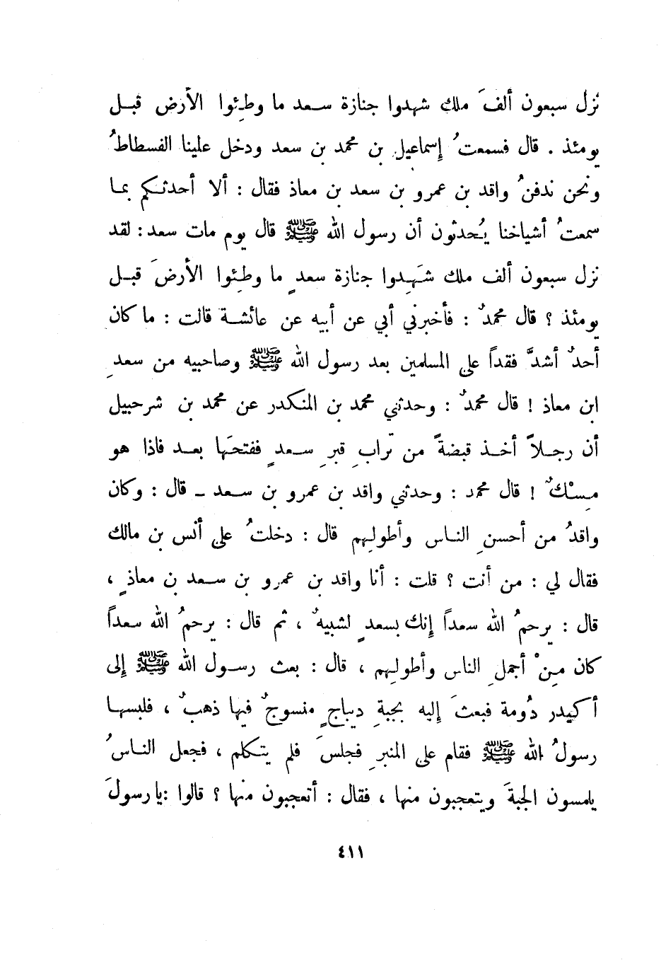 نزل سبعون ألف ملك شهدوا جنازة سعد ما وطئوا الأرض قبل يومئذ. قال فسمعت إسماعيل بن محمد بن سعد ودخل علينا الفسطاط ونحن ندفن واقد بن عمرو بن سعد بن معاذ فقال: ألا أحدثكم بما سمعت أشياخنا يحدثون أن رسول الله صلى الله عليه وسلم قال يوم مات سعد: لقد نزل سبعون ألف ملك شهدوا جنازة سعد ما وطئوا الأرض قبل يومئذ؟ قال محمد: فأخبرني أبي عن أبيه عن عائشة قالت: ما كان أحد أشد فقدا على المسلمين بعد رسول الله صلى الله عليه وسلم وصاحبيه من سعد بن معاذ! قال محمد: وحدثني محمد بن المنكدر عن محمد بن شرحبيل أن رجلا أخذ قبضة من تراب قبر سعد ففتحها بعد فإذا هو مسك! قال محمد: وحدثني واقد بن عمرو بن سعد - قال: وكان واقد من أحسن الناس وأطولهم قال: دخلت على أنس بن مالك فقال لي: من أنت؟ قلت: أنا واقد بن عمرو بن سعد بن معاذ، قال: يرحم الله سعدا إنك بسعد لشبيه، ثم قال: يرحم الله سعدا كان من أجمل الناس وأطولهم، قال: بعث رسول الله صلى الله عليه وسلم إلى أكيدر دومة فبعث إليه بجبة ديباج منسوج فيها ذهب، فلبسها رسول الله صلى الله عليه وسلم فقام على المنبر فجلس فلم يتكلم، فجعل الناس يلمسون الجبة ويتعجبون منها، فقال: أتعجبون منها؟ قالوا: يا رسول