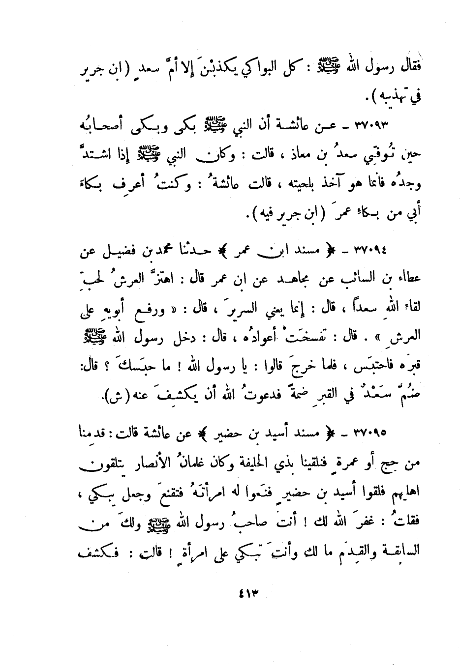 37095- "مسند أسيد بن حضير" عن عائشة قالت: قدمنا من حج أو عمرة فنلقينا؟؟ بذي الحليفة وكان غلمان الأنصار يتلقون أهليهم فلقوا أسيد بن حضير فنعوا له امرأته فتقنع وجعل يبكي، فقلت: غفر الله لك! أنت صاحب رسول الله صلى الله عليه وسلم ولك من السابقة والقدم مالك وأنت تبكي على امرأة! قالت: فكشف
