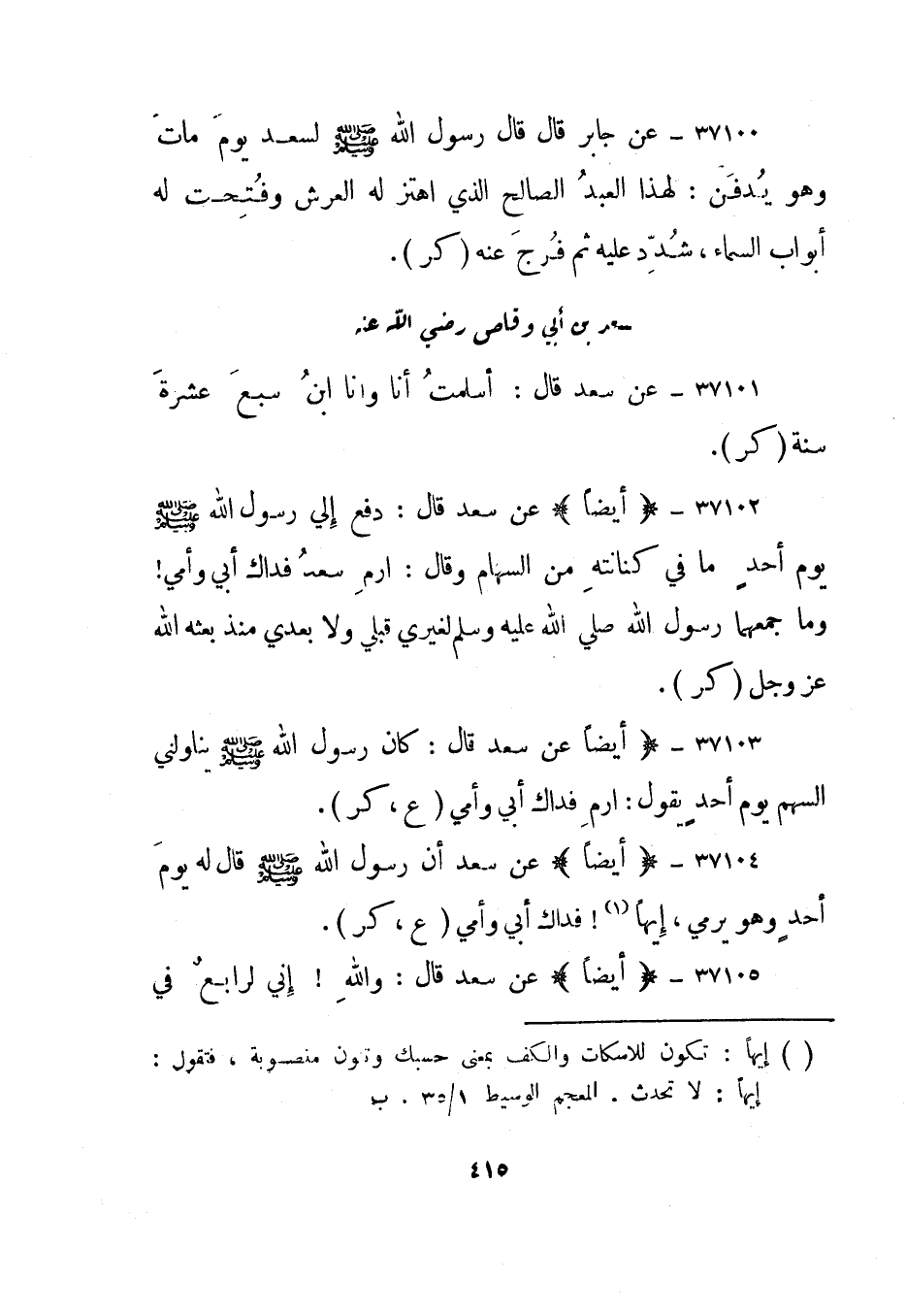 37103- "أيضا" عن سعد قال: كان رسول الله صلى الله عليه وسلم يناولني السهم يوم أحد يقول: ارم فداك أبي وأمي. "ع، كر".