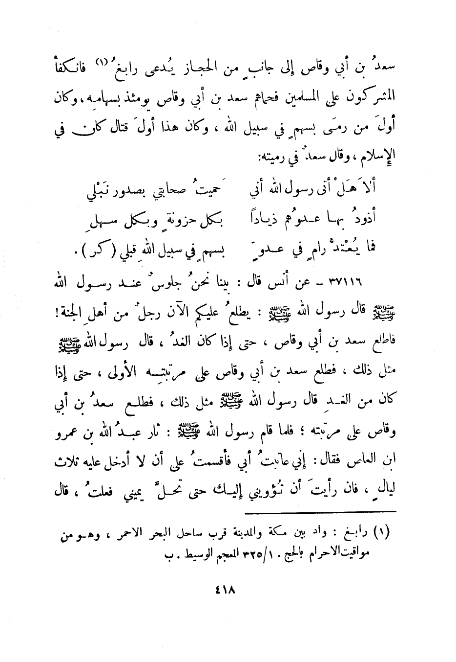 37116- عن أنس قال: بينا نحن جلوس عند رسول الله صلى الله عليه وسلم قال رسول الله صلى الله عليه وسلم: يطلع عليكم الآن رجل من أهل الجنة! فاطلع سعد بن أبي وقاص، حتى إذا كان الغد، قال رسول الله صلى الله عليه وسلم مثل ذلك، فطلع سعد بن أبي وقاص على مرتبته الأولى، حتى إذا كان من الغد قال رسول الله صلى الله عليه وسلم مثل ذلك، فطلع سعد بن أبي وقاص على مرتبته؛ فلما قام رسول الله صلى الله عليه وسلم: ثار عبد الله بن عمرو بن العاص فقال: إني عاتبت أبي فأقسمت على أن لا أدخل عليه ثلاث ليال، فإن رأيت أن تؤويني إليك حتى تحل يميني فعلت، قال