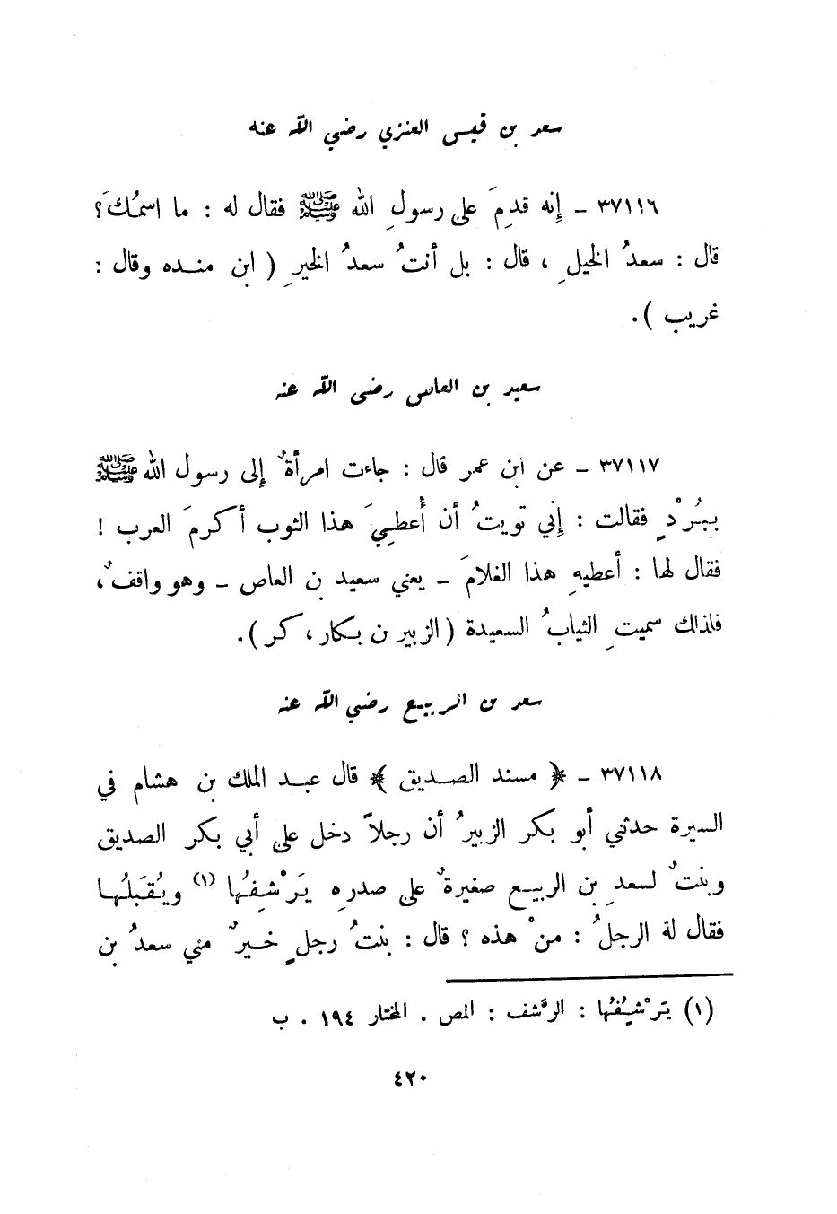 37117- إنه قدم على رسول الله صلى الله عليه وسلم فقال له: ما اسمك؟ قال: سعد الخيل، قال: بل أنت سعد الخير. ابن منده وقال: غريب.