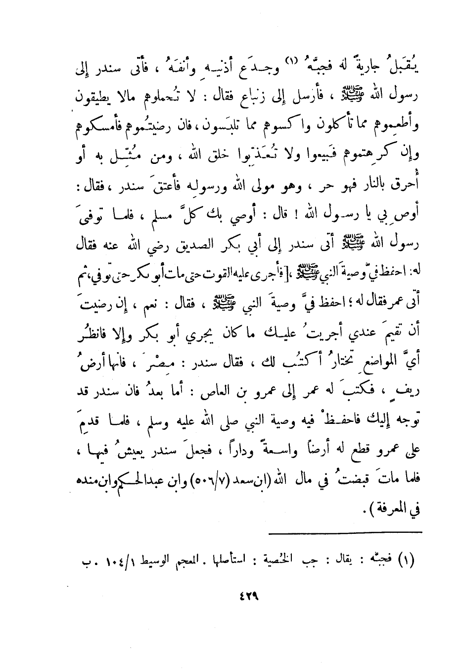 يقبل جارية له فجبه1 وجدع أذنيه وأنفه، فأتى سندر إلى رسول الله صلى الله عليه وسلم، فأرسل إلى زنباع فقال: لا تحملوهم مالا يطيقون وأطعموهم مما تأكلون واكسوهم مما تلبسون، فإن رضيتموهم فأمسكوهم وإن كرهتموهم فبيعوا ولا تعذبوا خلق الله، ومن مثل به أو أحرق بالنار فهو حر، وهو مولى الله ورسوله فأعتق سندر، فقال: أوص بي يا رسول الله! قال: أوصي بك كل مسلم، فلما توفى رسول الله صلى الله عليه وسلم أتى سندر إلى أبي بكر الصديق رضي الله عنه فقال له: احفظ في وصية النبي صلى الله عليه وسلم، [فأجرى عليه القوت حتى مات أبو بكر حتى توفي، ثم أتى عمر فقال له؛ احفظ في وصية النبي صلى الله عليه وسلم، فقال: نعم، إن رضيت أن تقيم عندي أجريت عليك ما كان يجري أبو بكر وإلا فانظر أي المواضع تختار أكتب لك، فقال سندر: مصر، فإنها أرض ريف، فكتب له عمر إلى عمرو بن العاص: أما بعد فإن سندر قد توجه إليك فاحفظ فيه وصية النبي صلى الله عليه وسلم، فلما قدم على عمرو قطع له أرضا واسعة ودارا، فجعل سندر يعيش فيها، فلما مات قبضت في مال الله."ابن سعد "7/506" وابن عبد الحكم وابن منده في المعرفة".