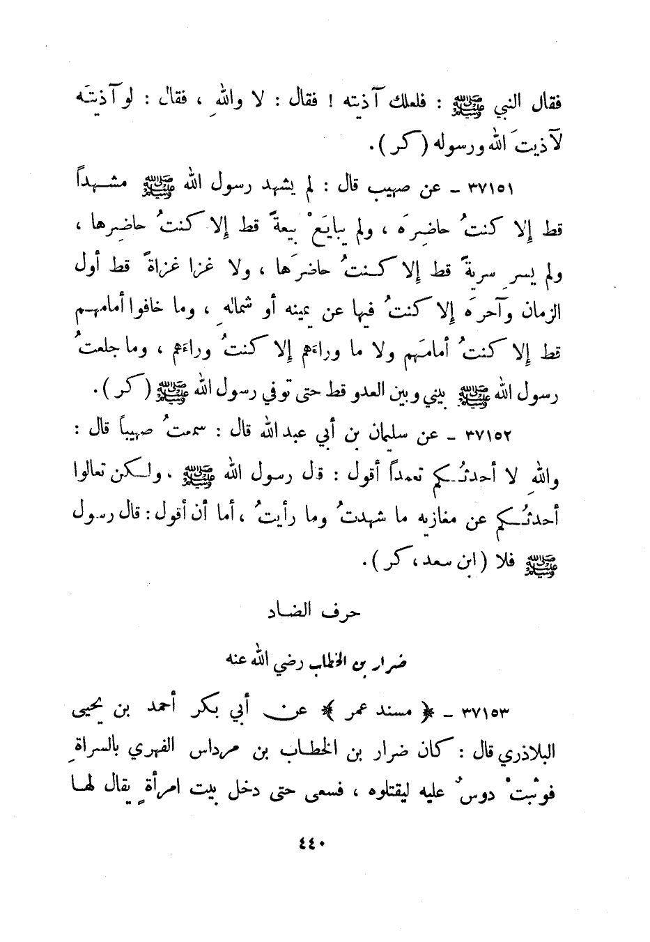 37152- عن صهيب قال: لم يشهد رسول الله صلى الله عليه وسلم مشهدا قط إلا كنت حاضره، ولم يبايع بيعة قط إلا كنت حاضرها، ولم يسر سرية قط إلا كنت حاضرها، ولا غزا غزاة قط أول الزمان وآخره إلا كنت فيها عن يمينه أو شماله، وما خافوا أمامهم قط إلا كنت أمامهم ولا ما وراءهم إلا كنت وراءهم، وما جعلت رسول الله صلى الله عليه وسلم بيني وبين العدو قط حتى توفي رسول الله صلى الله عليه وسلم. "كر".