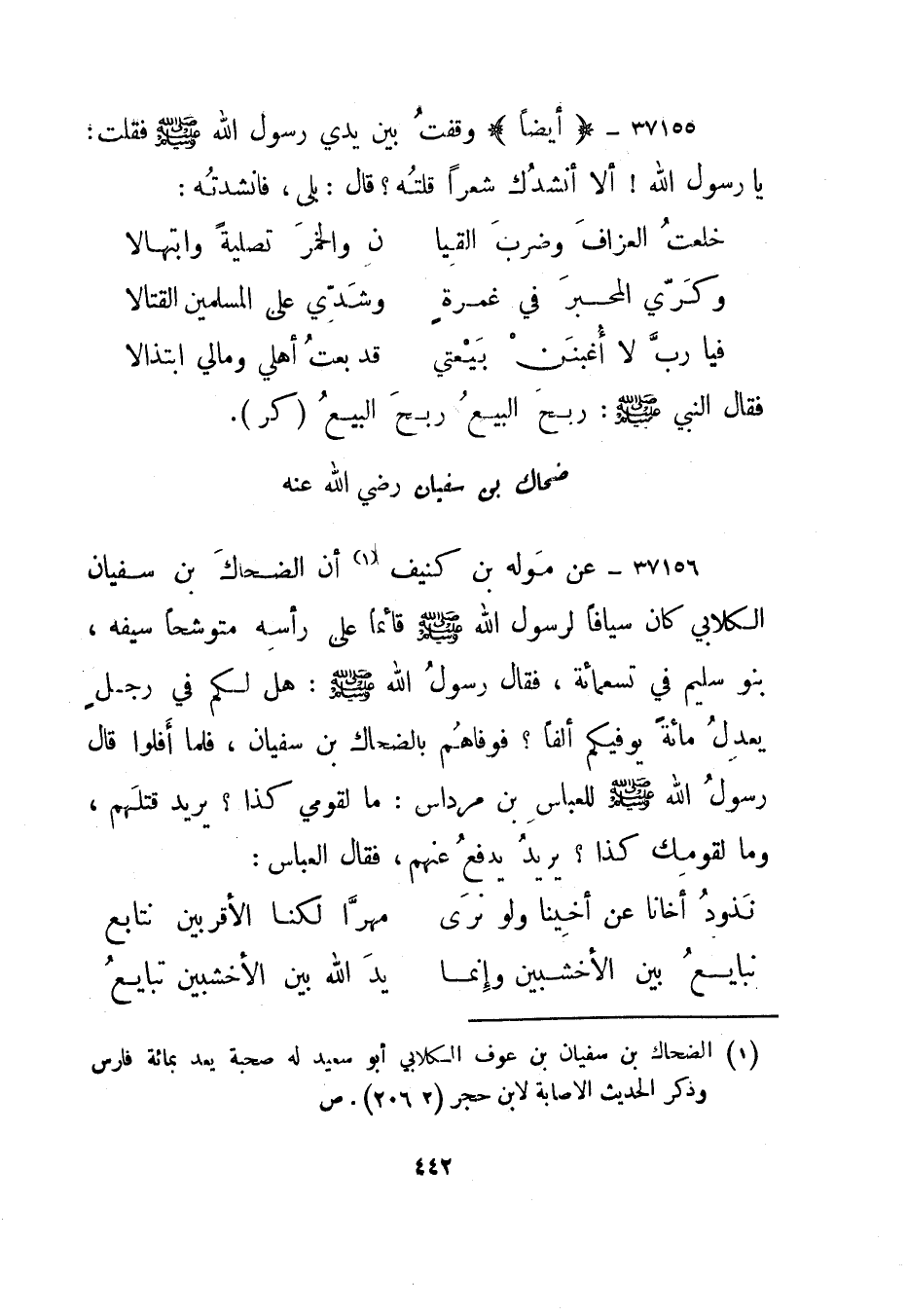 37157- عن موله بن كنيف1 أن الضحاك بن سفيان الكلابي كان سيافا لرسول الله صلى الله عليه وسلم قائما على رأسه متوشحا سيفه، بنو سليم في تسعمائة، فقال رسول الله صلى الله عليه وسلم: هل لكم في رجل يعدل مائة يوفيكم ألفا؟ فوفاهم بالضحاك بن سفيان، فلما أفلوا قال رسول الله صلى الله عليه وسلم للعباس بن مرداس: ما لقومي كذا؟ يريد قتلهم، وما لقومك كذا؟ يريد يدفع عنهم، فقال العباس:
