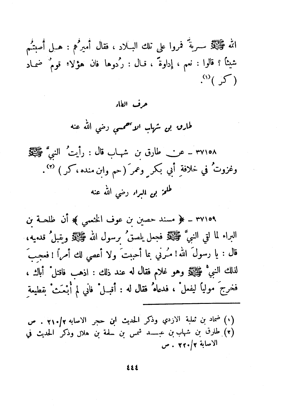 37159- عن طارق بن شهاب قال: رأيت النبي صلى الله عليه وسلم وغزوت في خلافة أبي بكر وعمر. "حم" وابن منده، "كر"2