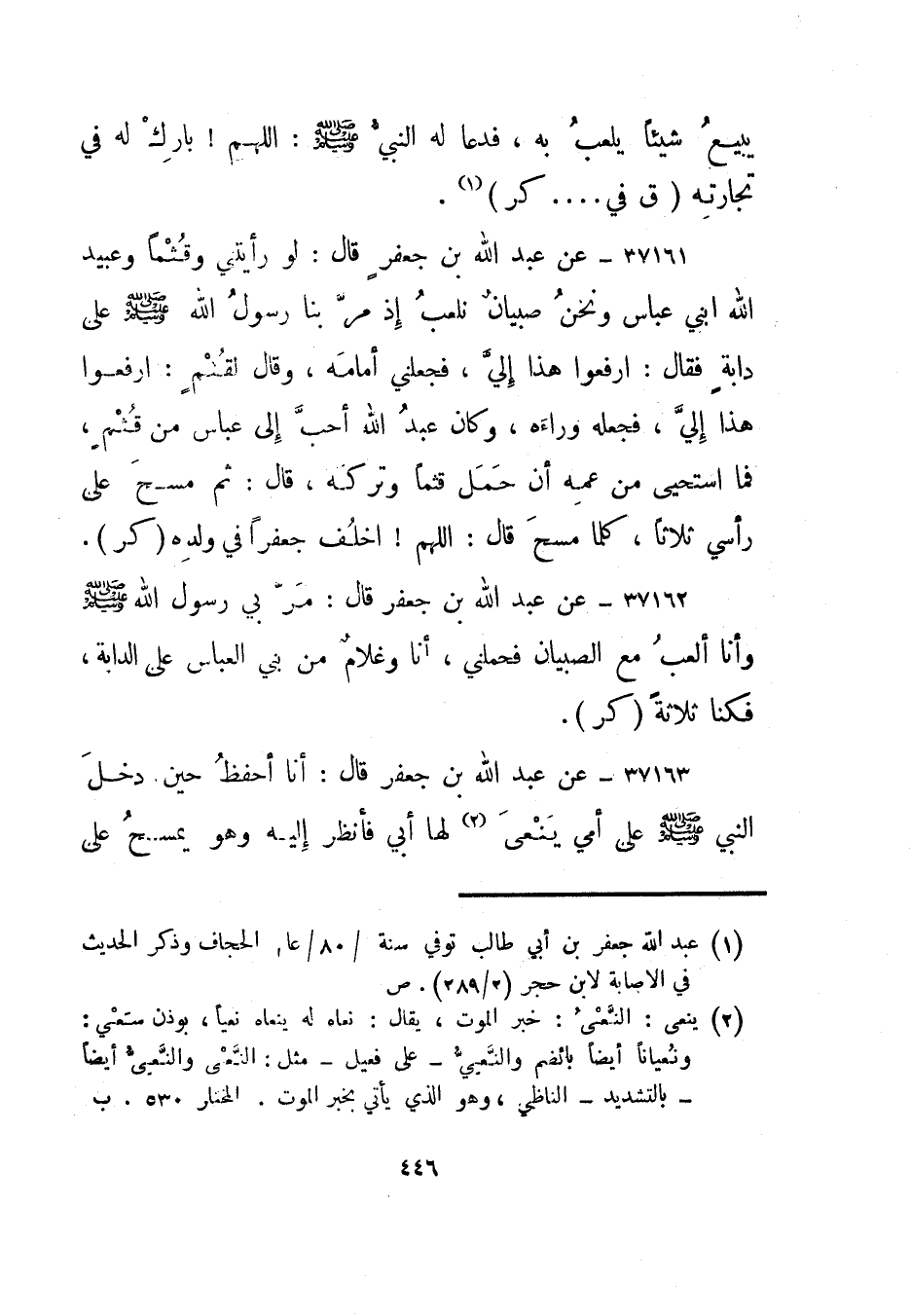 37164- عن عبد الله بن جعفر قال: أنا أحفظ حين دخل النبي صلى الله عليه وسلم على أمي ينعى2 لها أبي فأنظر إليه وهو يمسح على