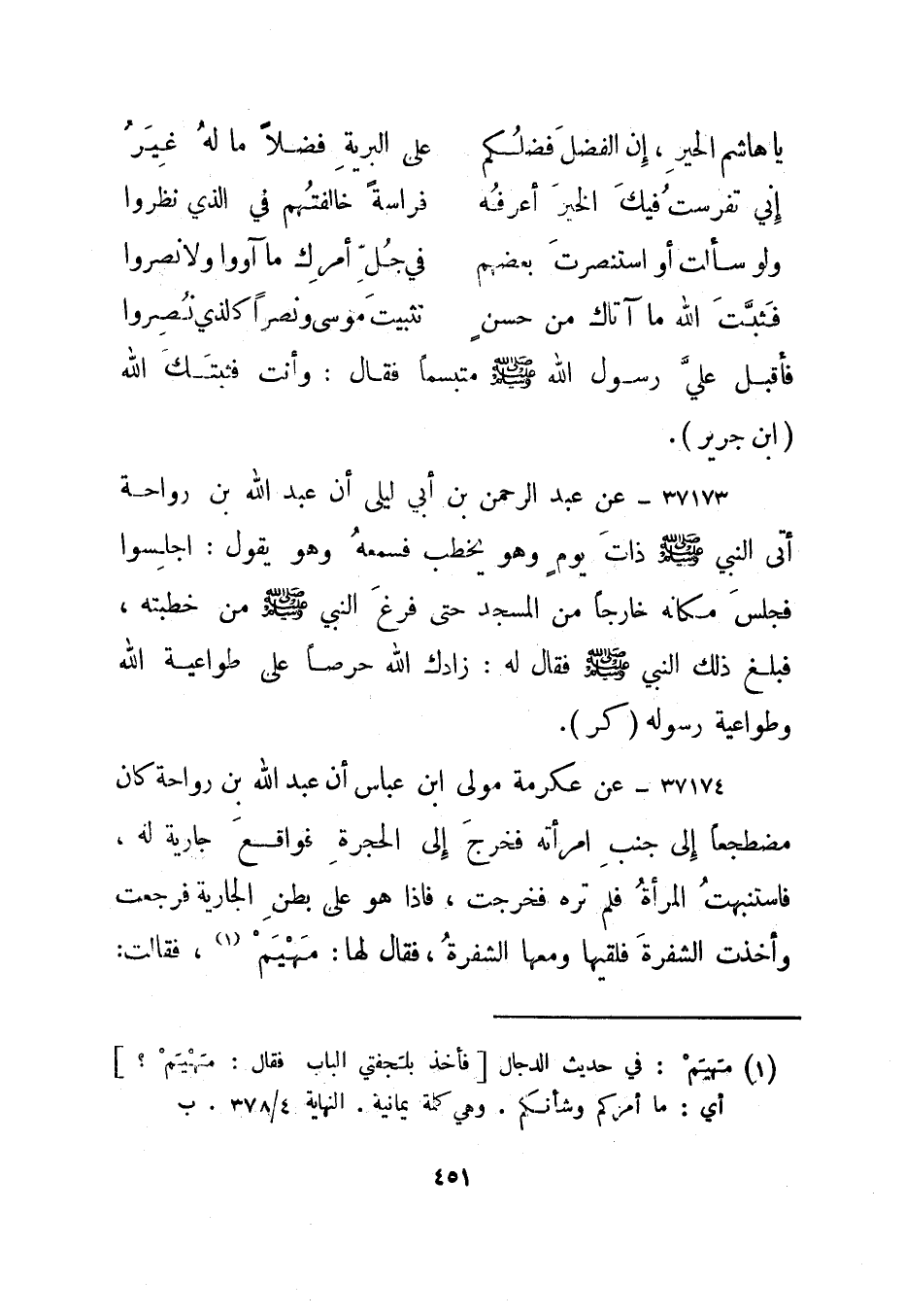 37175- عن عكرمة مولى ابن عباس أن عبد الله بن رواحة كان مضطجعا إلى جنب امرأته فخرج إلى الحجرة فواقع جارية له، فاستنبهت المرأة فلم تره فخرجت، فإذا هو على بطن الجارية فرجعت وأخذت الشفرة فلقيها ومعها الشفرة، فقال لها: مهيم1، فقالت: