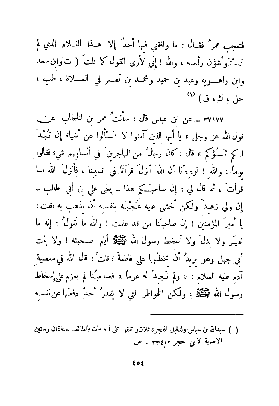 37178- عن ابن عباس قال: سألت عمر بن الخطاب عن قول الله عز وجل {يَا أَيُّهَا الَّذِينَ آمَنُوا لا تَسْأَلوا عَنْ أَشْيَاءَ إِنْ تُبْدَ لَكُمْ تَسُؤْكُمْ} قال: كان رجال من المهاجرين في أنسابهم شيء فقالوا يوما: والله! لوددنا أن الله أنزل قرآنا في نسبنا، فأنزل الله ما قرأت، ثم قال لي: إن صاحبكم هذا - يعني علي بن أبي طالب - إن ولي زهد ولكن أخشى عليه عجبه بنفسه أن يذهب به، قلت: يا أمير المؤمنين! إن صاحبنا من قد علمت! والله ما نقول: إنه ما غير ولا بدل ولا أسخط رسول الله صلى الله عليه وسلم أيام صحبته! ولا بنت أبي جهل وهو يريد أن يخطبها على فاطمة؟ قلت: قال الله في معصية آدم عليه السلام: {وَلَمْ نَجِدْ لَهُ عَزْماً} فصاحبنا لم يعزم على إسخاط رسول الله صلى الله عليه وسلم، ولكن الخواطر التي لا يقدر أحد دفعها عن نفسه