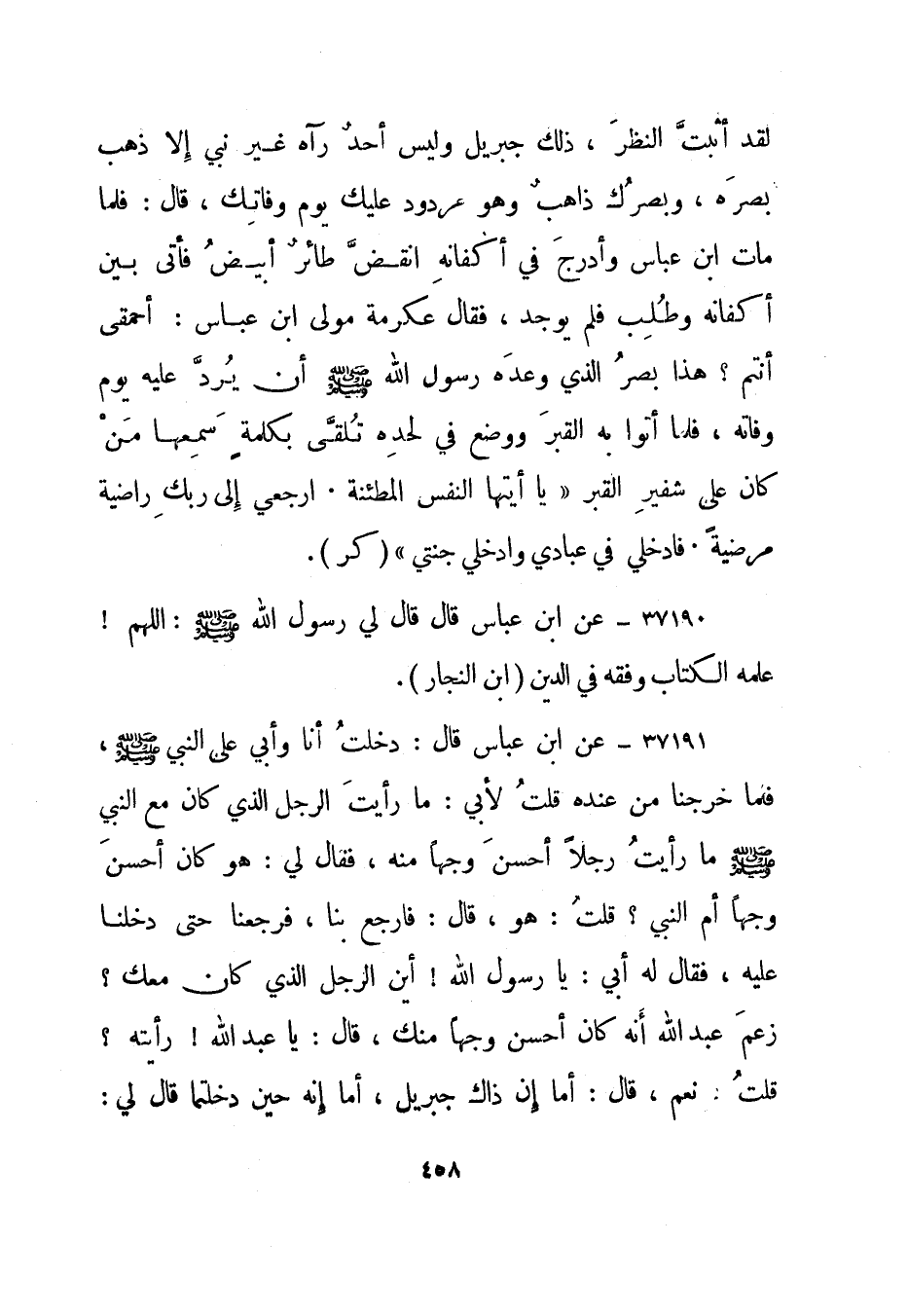 37192- عن ابن عباس قال: دخلت أنا وأبي على النبي صلى الله عليه وسلم، فلما خرجنا من عنده قلت لأبي: ما رأيت الرجل الذي كان مع النبي صلى الله عليه وسلم ما رأيت رجلا أحسن وجها منه، فقال لي: هو كان أحسن وجها أم النبي؟ قلت: هو، قال: فارجع بنا، فرجعنا حتى دخلنا عليه، فقال له أبي: يا رسول الله! أين الرجل الذي كان معك؟ زعم عبد الله أنه كان أحسن وجها منك، قال: يا عبد الله! رأيته؟ قلت: نعم، قال: أما إن ذاك جبريل، أما إنه حين دخلتما قال لي: