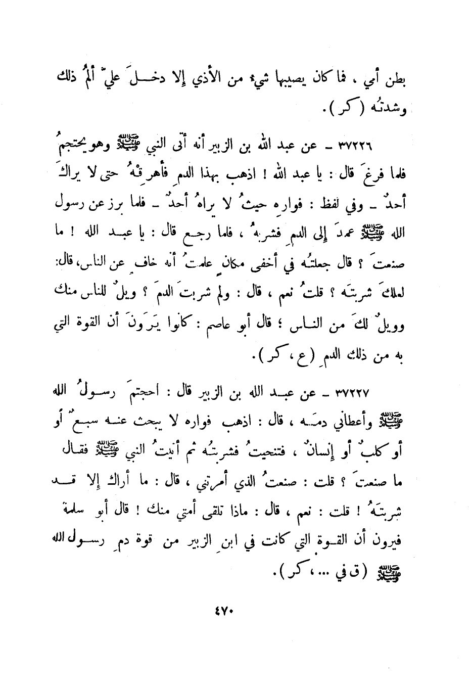 37228- عن عبد الله بن الزبير قال: احتجم رسول الله صلى الله عليه وسلم وأعطاني دمه، قال: اذهب فواره لا يبحث عنه سبع أو كلب أو إنسان، فتنحيت فشربته ثم أتيت النبي صلى الله عليه وسلم فقال ما صنعت؟ قلت: صنعت الذي أمرتني، قال: ما أراك إلا قد شربته! قلت: نعم، قال: ماذا تلقى أمتي منك! قال أبو سلمة فيرون أن القوة التي كانت في ابن الزبير من قوة دم رسول الله صلى الله عليه وسلم. "ق" في ... ، "كر".