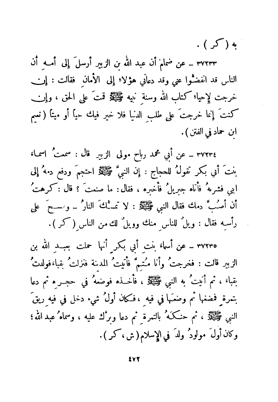 37236- عن أسماء بنت أبي بكر أنها حملت بعبد الله بن الزبير قالت: فخرجت وأنا متم فأتيت المدينة فنزلت بقباء فولدت بقباء، ثم أتيت به النبي صلى الله عليه وسلم، فأخذه فوضعه في حجره ثم دعا بتمرة فمضغها في فيه، فكان أول شيء دخل في فيه ريق النبي صلى الله عليه وسلم، ثم حنكه بالتمرة ثم دعا وبرك عليه، وسماه عبد الله؛ وكان أول مولود ولد في الإسلام. "ش، كر".