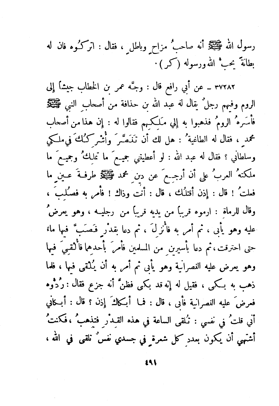 37283- عن أبي رافع قال: وجه عمر بن الخطاب جيشا إلى الروم وفيهم رجل يقال له عبد الله بن حذافة من أصحاب النبي صلى الله عليه وسلم فأسره الروم فذهبوا به إلي ملكهم فقالوا له: إن هذا من أصحاب محمد، فقال له الطاغية: هل لك أن تنصر وأشركك في ملكي وسلطاني؟ فقال له عبد الله: لو أعطيتني جميع ما تملك وجميع ما ملكته العرب على أن أرجع عن دين محمد صلى الله عليه وسلم طرفة عين ما فعلت! قال: إذن أقتلك، قال: أنت وذاك! فأمر به فصلب، وقال للرماة: ارموه قريبا من يديه قريبا من رجليه، وهو يعرض عليه وهو يأبى، ثم أمر به فأنزل، ثم دعا بقدر فصب فيها ماء حتى احترقت، ثم دعا بأسيرين من المسلمين فأمر بأحدهما فألقي فيها وهو يعرض عليه النصرانية وهو يأبى ثم أمر به أن يلقى فيها، فلما ذهب به بكى، فقيل له إنه قد بكى فظن أنه جزع فقال: ردوه فعرض عليه النصرانية فأبى، قال: فما أبكاك إذن؟ قال: أبكاني أني قلت في نفسي: تلقى الساعة في هذه القدر فتذهب، فكنت أشتهي أن يكون بعدد كل شعرة في جسدي نفس تلقى في الله،