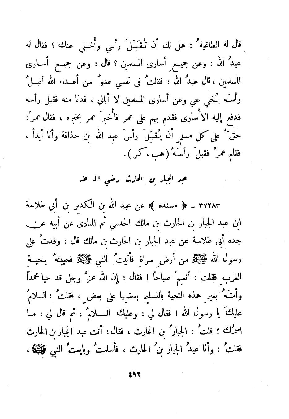 37284- "مسنده" عن عبد الله بن الكدير بن أبي طلاسة بن عبد الجبار بن الحارث بن مالك الحدسي ثم المنادى عن أبيه عن جده أبي طلاسة عن عبد الجبار بن الحارث بن مالك قال: وفدت على رسول الله صلى الله عليه وسلم من أرض سراة فأتيت النبي صلى الله عليه وسلم فحييته بتحية العرب فقلت: أنعم صباحا! فقال: إن الله عز وجل قد حيا محمدا وأمته بغير هذه التحية بالتسليم بعضها على بعض، فقلت: السلام عليك يا رسول الله! فقال لي: وعليك السلام، ثم قال لي: ما اسمك؟ قلت: الجبار بن الحارث، فقال: أنت عبد الجبار بن الحارث فقلت: وأنا عبد الجبار بن الحارث، فأسلمت وبايعت النبي صلى اله عليه وسلم،