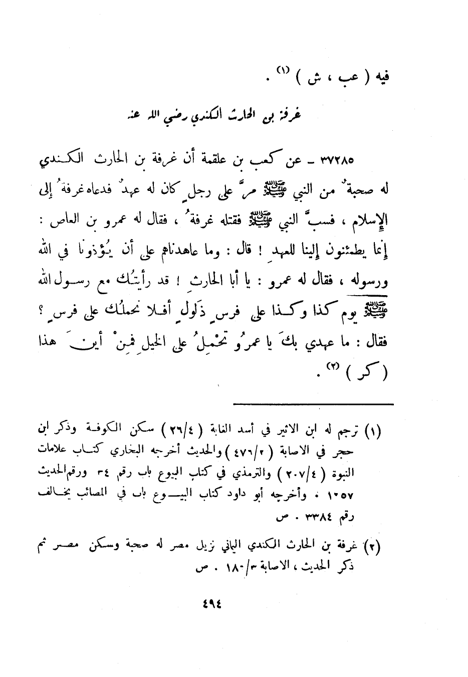37286- عن كعب بن علقمة أن غرفة بن الحارث الكندي له صحبة من النبي صلى الله عليه وسلم مر على رجل كان له عهد فدعاه غرفة إلى الإسلام، فسب النبي صلى الله عليه وسلم فقتله غرفة، فقال له عمرو بن العاص: إنما يطمئنون إلينا للعهد! قال: وما عاهدناهم على أن يؤذونا في الله ورسوله، فقال له عمرو: يا أبا الحارث! قد رأيتك مع رسول الله صلى الله عليه وسلم يوم كذا وكذا على فرس ذلول أفلا نحملك على فرس؟ فقال: ما عهدي بك يا عمرو تحمل على الخيل فمن أين هذا. "كر"2