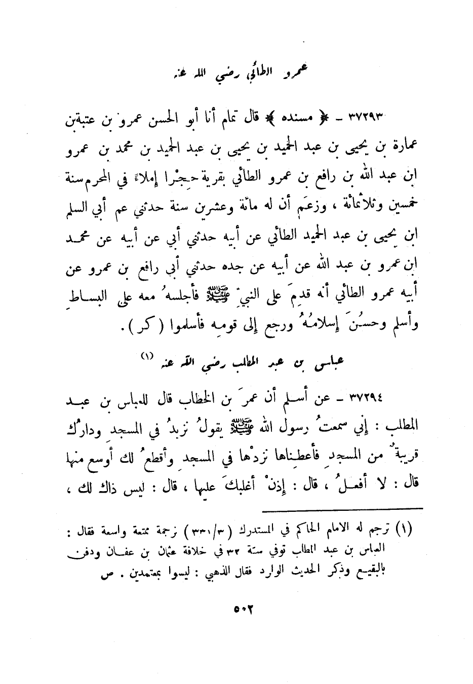 37294- "مسنده" قال تمام أنا أبو الحسن عمرو بن عتبة بن عمارة بن يحيى بن عبد الحميد بن يحيى بن عبد الحميد بن محمد بن عمرو بن عبد الله بن رافع بن عمرو الطائي بقرية حجرا إملاء في المحرم سنة خمسين وثلاثمائة، وزعم أن له مائة وعشرين سنة حدثني عم أبي السلم بن يحيى ابن عبد الحميد الطائي عن أبيه حدثني أبي عن أبيه عن محمد بن عمرو بن عبد الله عن أبيه عن جده حدثني أبي رافع بن عمرو عن أبيه عمرو الطائي أنه قدم على النبي صلى الله عليه وسلم فأجلسه معه على البساط وأسلم وحسن إسلامه ورجع إلى قومه فأسلموا. "كر".