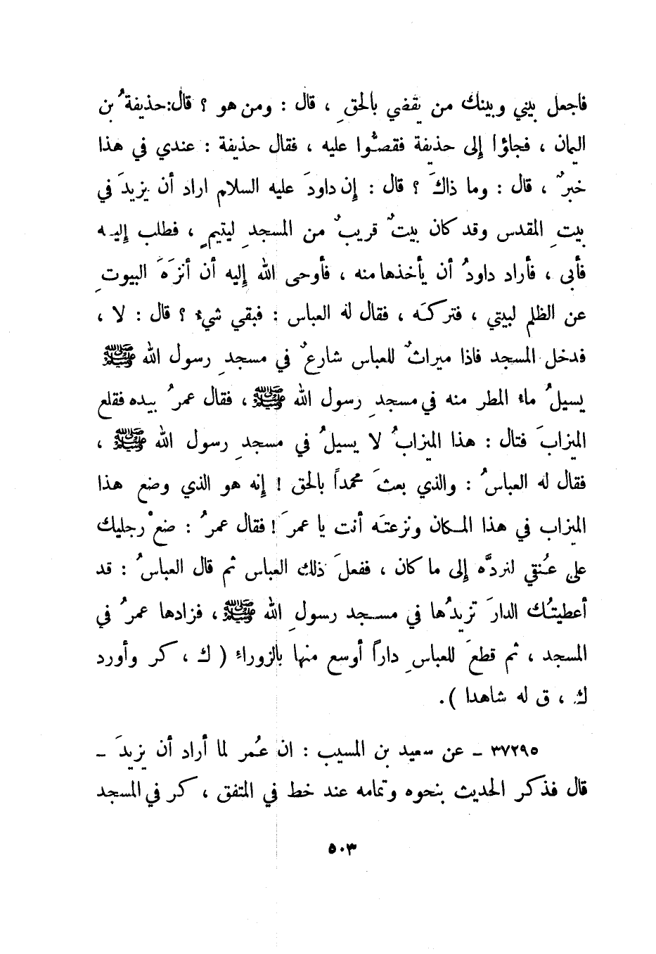 فاجعل بيني وبينك من يقضي بالحق، قال: ومن هو؟ قال: حذيفة بن اليمان، فجاؤوا إلى حذيفة فقصوا عليه، فقال حذيفة: عندي في هذا خبر، قال: وما ذاك؟ قال: إن داود عليه السلام أراد أن يزيد في بيت المقدس وقد كان بيت قريب من المسجد ليتيم، فطلب إليه فأبى، فأراد داود أن يأخذها منه، فأوحى الله إليه أن أنزه البيوت عن الظلم لبيتي، فتركه، فقال له العباس: فبقي شيء؟ قال: لا، فدخل المسجد فإذا ميراث للعباس شارع في مسجد رسول الله صلى الله عليه وسلم يسيل ماء المطر منه في مسجد رسول الله صلى الله عليه وسلم، فقال عمر بيده فقلع الميزاب فقال: هذا الميزاب لا يسيل في مسجد رسول الله صلى الله عليه وسلم، فقال له العباس: والذي بعث محمدا بالحق! إنه هو الذي وضع هذا الميزاب في هذا المكان ونزعته أنت يا عمر! فقال عمر: ضع رجليك على عنقي لنرده إلى ما كان، ففعل ذلك العباس ثم قال العباس: قد أعطيتك الدار تزيدها في مسجد رسول الله صلى الله عليه وسلم، فزادها عمر في المسجد، ثم قطع للعباس دارا أوسع منها بالزوراء. "ك، كر وأورد ك، ق له شاهدا".