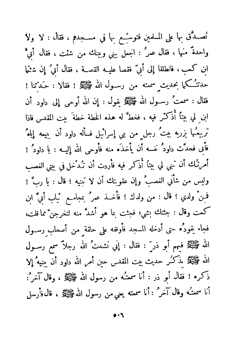 تصدق بها على المسلمين فتوسع بها في مسجدهم، فقال: لا ولا واحدة منها، فقال عمر: اجعل بيني وبينك من شئت، فقال أبي بن كعب، فانطلقا إلى أبي فقصا عليه القصة، فقال أبي إن شئتما حدثتكما بحديث سمعته من رسول الله صلى الله عليه وسلم! فقالا: حدثنا! فقال: سمعت رسول الله صلى الله عليه وسلم يقول: إن الله أوحى إلى داود أن ابن لي بيتا أذكر فيه، فخط له هذه الخطة بيت المقدس فإذا تربيعها يزريه بيت رجل من بني إسرائيل فسأله داود أن يبيعه إياه فأبى فحدث داود نفسه أن يأخذه منه فأوحى الله إليه: يا داود! أمرتك أن تبني لي بيتا أذكر فيه فأردت أن تدخل في بيتي الغصب وليس من شأني الغصب وإن عقوبتك أن لا تبنيه؛ قال: يا رب! فمن ولدي؟ قال: من ولدك؟ فأخذ عمر بمجامع ثياب أبي بن كعب وقال: جئتك بشيء فجئت بما هو أشد منه لتخرجن مما قلت، فجاء يقوده حتى أدخله المسجد فأوقفه على حلقة من أصحاب رسول الله صلى الله عليه وسلم فيهم أبو ذر: فقال: إني نشدت الله رجلا سمع رسول الله صلى الله عليه وسلم يذكر حديث بيت المقدس حين أمر الله داود أن يبنيه إلا ذكره! فقال أبو ذر: أنا سمعته من رسول الله صلى الله عليه وسلم، وقال آخر: أنا سمعته وقال آخر: أنا سمعته يعني من رسول الله صلى الله عليه وسلم، قال فأرسل