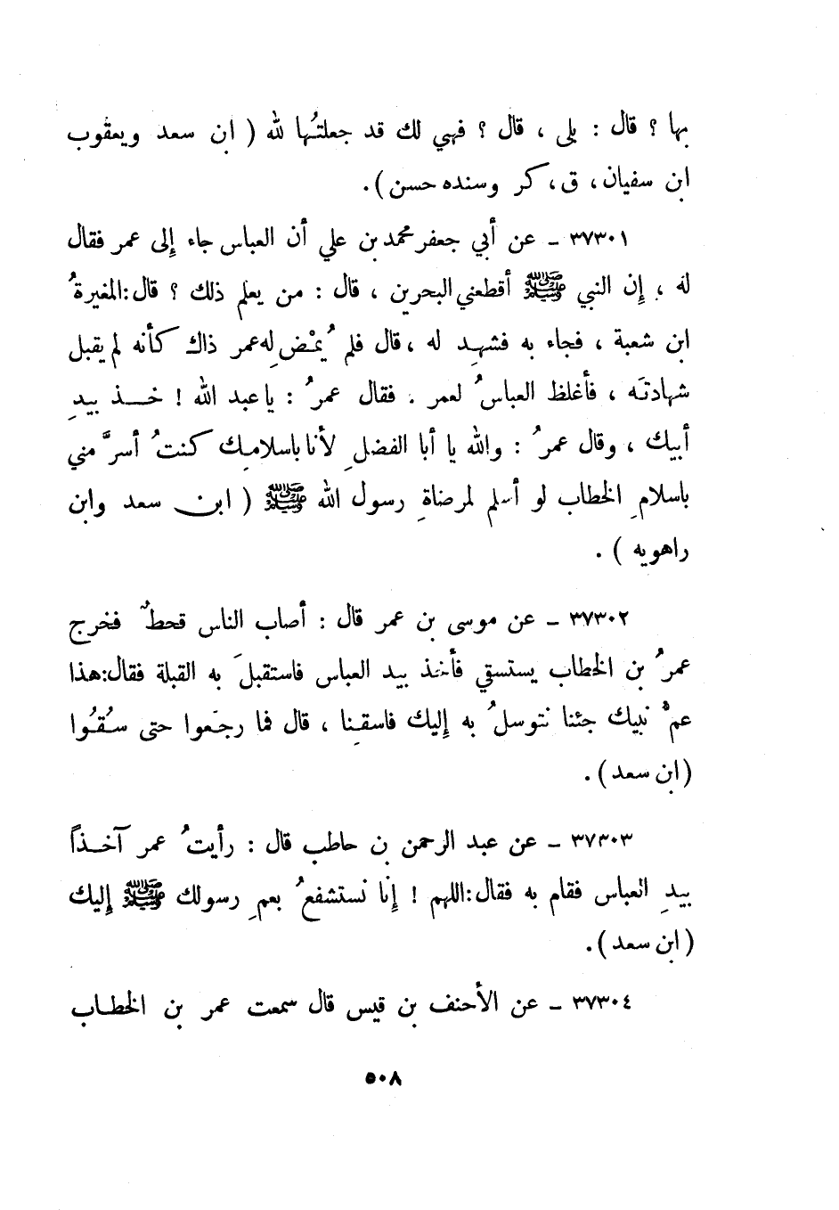 37304- عن عبد الرحمن بن حاطب قال: رأيت عمر آخذا بيد العباس فقام به فقال: اللهم! إنا نستشفع بعم رسولك صلى الله عليه وسلم إليك."ابن سعد".