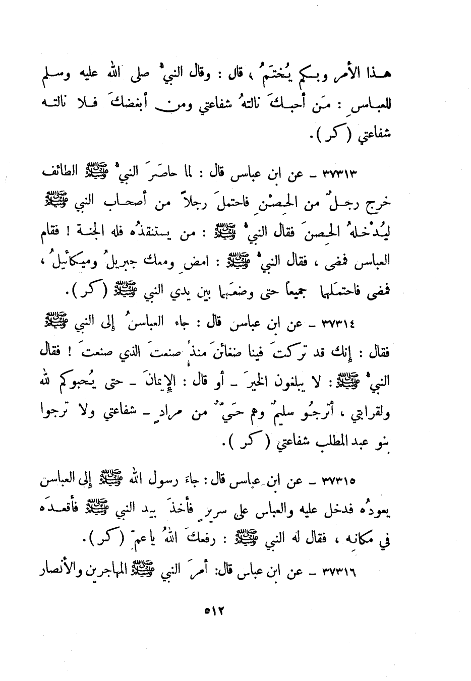 37315- عن ابن عباس قال: جاء العباس إلى النبي صلى الله عليه وسلم فقال: إنك قد تركت فينا ضغائن منذ صنعت الذي صنعت! فقال النبي صلى الله عليه وسلم: لا يبلغون الخير - أو قال: الإيمان - حتى يحبوكم لله ولقرابتي، أترجو سليم وهم حي من مراد - شفاعتي ولا ترجوا بنو عبد المطلب شفاعتي. "كر".