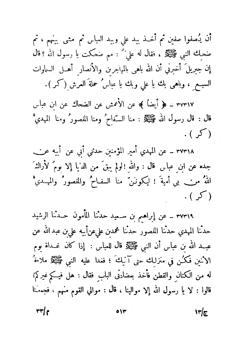 37319- عن المهدي أمير المؤمنين حدثني أبي عن أبيه عن جده عن ابن عباس قال: والله! لو لم يبق من الدنيا إلا يوم لأراك الله من بني أمية! ليكونن منا السفاح والمنصور والمهدي. "كر".