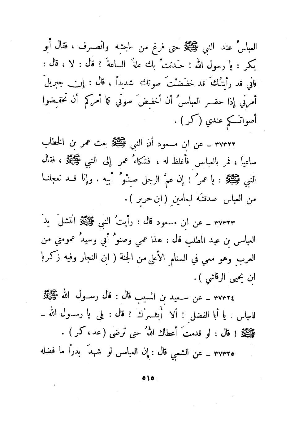37324- عن ابن مسعود قال: رأيت النبي صلى الله عليه وسلم انتشل يد العباس بن عبد المطلب قال: هذا عمي وصنو أبي وسيد عمومتي من العرب وهو معي في السنام الأعلى من الجنة.