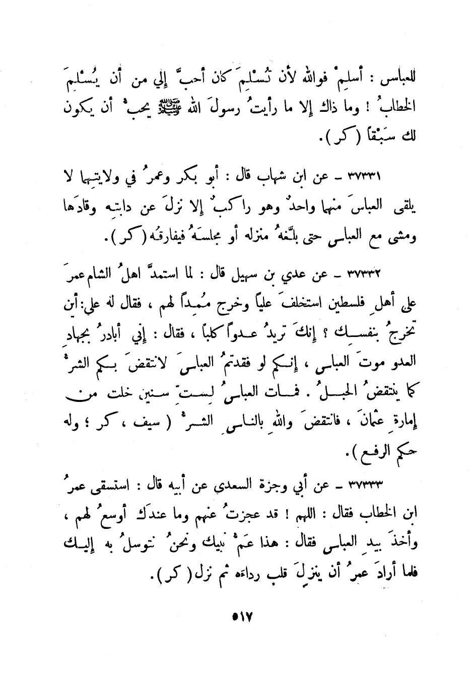 37332- عن ابن شهاب قال: أبو بكر وعمر في ولايتهما لا يلقى العباس منهما واحد وهو راكب إلا نزل عن دابته وقادها ومشى مع العباس حتى بلغه منزله أو مجلسه فيفارقه. "كر".