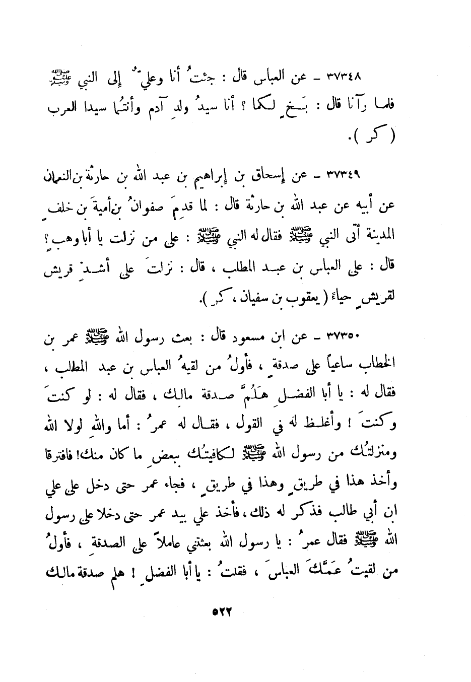 37351- عن ابن مسعود قال: بعث رسول الله صلى الله عليه وسلم عمر بن الخطاب ساعيا على صدقة، فأول من لقيه العباس بن عبد المطلب، فقال له: يا أبا الفضل هلم صدقة مالك، فقال له: لو كنت وكنت! وأغلظ له في القول، فقال له عمر: أما والله لولا الله ومنزلتك من رسول الله صلى الله عليه وسلم لكافيتك ببعض ما كان منك! فافترقا وأخذ هذا في طريق وهذا في طريق، فجاء عمر حتى دخل على علي بن أبي طالب فذكر له ذلك، فأخذ علي بيد عمر حتى دخلا على رسول الله صلى الله عليه وسلم فقال عمر: يا رسول الله بعثتني عاملا على الصدقة، فأول من لقيت عمك العباس، فقلت: يا أبا الفضل! هلم صدقة مالك