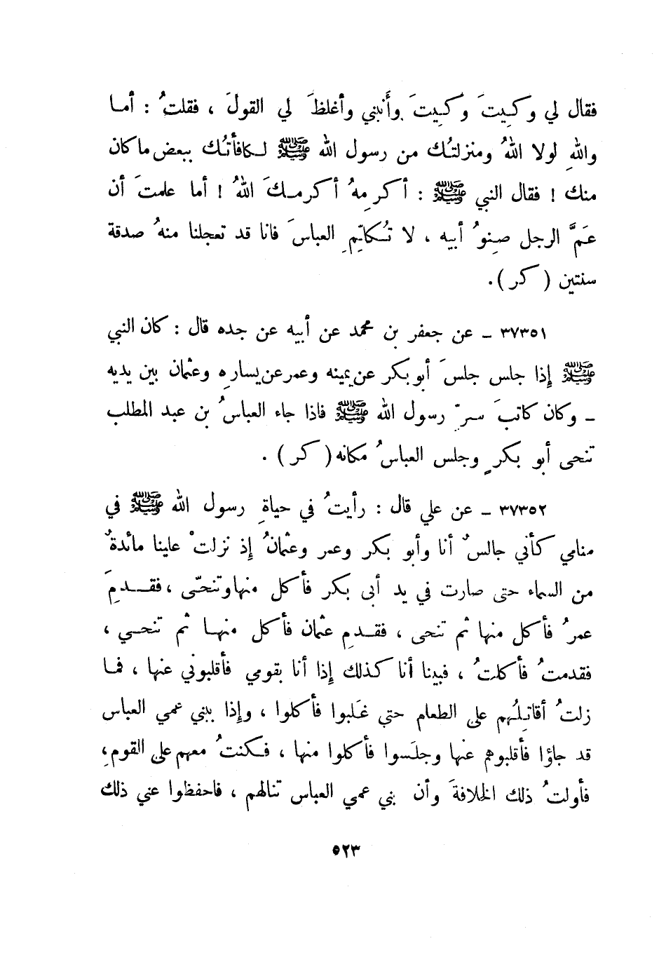 37352- عن جعفر بن محمد عن أبيه عن جده قال: كان النبي صلى الله عليه وسلم إذا جلس جلس أبو بكر عن يمينه وعمر عن يساره وعثمان بين يديه - وكان كاتب سر رسول الله صلى الله عليه وسلم فإذا جاء العباس بن عبد المطلب تنحى أبو بكر وجلس العباس مكانه. "كر".