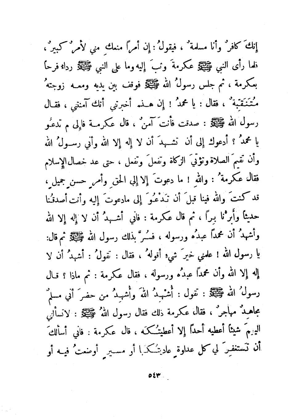 إنك كافر وأنا مسلمة، فيقول: إن أمرا منعك مني لأمر كبير، فلما رأى النبي صلى اله عليه وسلم عكرمة وثب إليه وما على النبي صلى الله عليه وسلم رداء فرحا بعكرمة، ثم جلس رسول الله صلى الله عليه وسلم فوقف بين يديه ومعه زوجته متنقبة، فقال: يا محمد! إن هذه أخبرتني أنك آمنتني، فقال رسول الله صلى الله عليه وسلم: صدقت فأنت آمن.قال عكرمة فإلى م تدعو يا محمد؟ أدعوك إلى أن تشهد أن لا إله إلا الله وأني رسول الله وأن تقيم الصلاة وتؤتي الزكاة وتفعل وتفعل، حتى عد خصال الإسلام فقال عكرمة: والله! ما دعوت إلا إلى الحق وأمر حسن جميل، قد كنت والله فينا قبل أن تدعو إلى ما دعوت إليه وأنت أصدقنا حديثا وأبرنا برا، ثم قال عكرمة: فإني أشهد أن لا إله إلا الله وأشهد أن محمدا عبده ورسوله، فسر بذلك رسول الله صلى الله عليه وسلم ثم قال: يا رسول الله! علمني خير شيء أقوله، فقال: تقول: أشهد أن لا إله إلا الله وأن محمدا عبده ورسوله، فقال عكرمة: ثم ماذا؟ قال رسول الله صلى الله عليه وسلم: تقول: أشهد الله وأشهد من حضر أني مسلم مجاهد مهاجر، فقال عكرمة ذلك فقال رسول الله صلى الله عليه وسلم: لا تسألني اليوم شيئا أعطيه أحدا إلا أعطيتكه، قال عكرمة: فإني أسألك أن تستغفر لي كل عداوة عاديتكها أو مسير أوضعت فيه