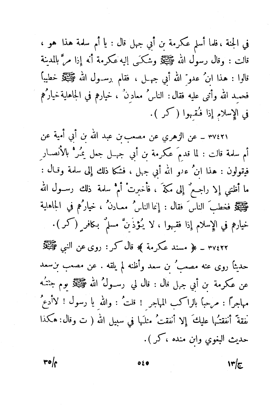 37423- "مسند عكرمة" قال كر: روى عن النبي صلى الله عليه وسلم حديثا روى عنه مصعب بن سعد وأظنه لم يلقه. عن مصعب بن سعد عن عكرمة بن أبي جهل قال: قال لي رسول الله صلى الله عليه وسلم يوم جئته مهاجرا: مرحبا بالراكب المهاجر! قلت: والله يا رسول! لا أدع نفقة أنفقتها عليك إلا أنفقت مثلها في سبيل الله. "ت" وقال: هكذا حديث البغوي وابن منده، "كر".