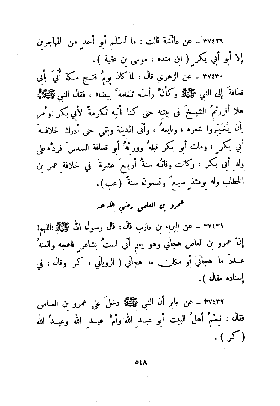 37430- عن عائشة قالت: ما أسلم أبو أحد من المهاجرين إلا أبو أبي بكر."ابن منده، موسى بن عقبة".