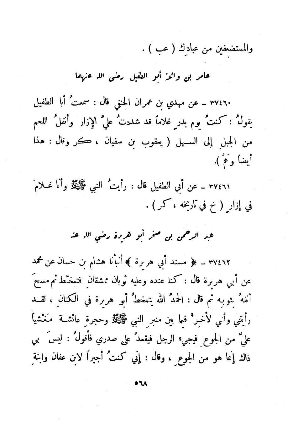 37461- عن مهدي بن عمران الحنفي قال: سمعت أبا الطفيل يقول: كنت يوم بدر غلاما قد شددت علي الإزار وأنقل اللحم من الجبل إلى السهل."يعقوب بن سفيان، كر وقال: هذا أيضا وهم".