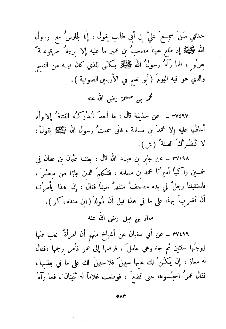 37499- عن جابر بن عبد الله قال: بعثنا عثمان بن عفان في خمسين راكبا أميرنا محمد بن مسلمة، فتكلم الذين جاؤوا من مصر، فاستقبلنا رجل في يده مصحف متقلد سيفا فقال: إن هذا يأمرنا أن نضرب بهذا على ما في هذا قبل أن تولد."ابن منده، كر".