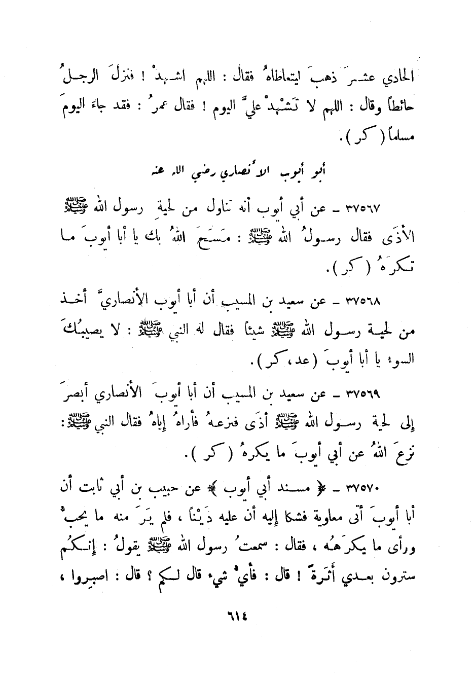 37573- "مسند أبي أيوب" عن حبيب بن أبي ثابت أن أبا أيوب أتى معاوية فشكا إليه أن عليه دينا، فلم ير منه ما يحب ورأى ما يكرهه، فقال: سمعت رسول الله صلى الله عليه وسلم يقول: إنكم سترون بعدي أثرة! قال: فأي شيء قال لكم؟ قال: اصبروا،