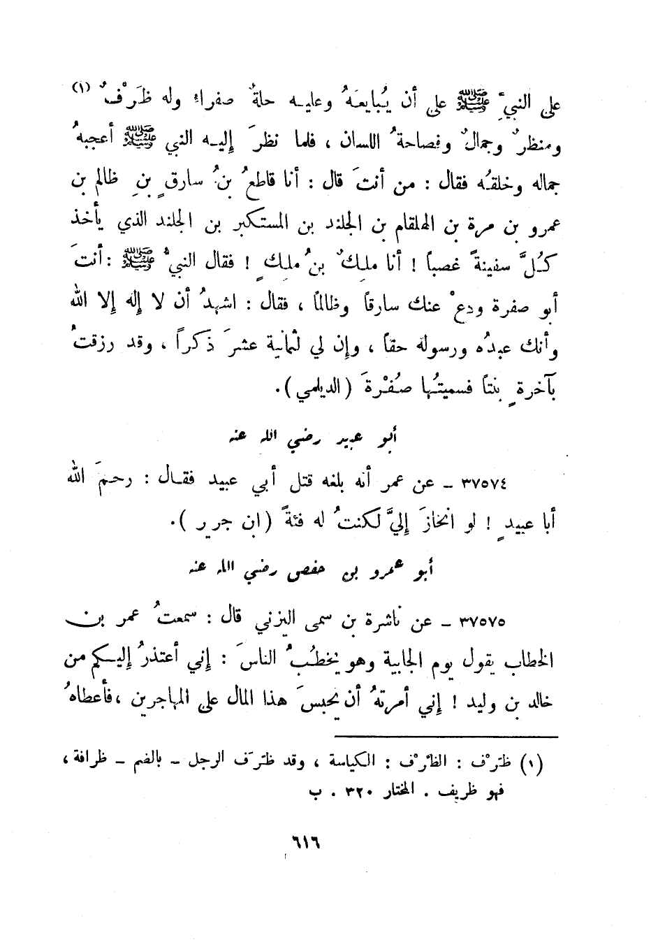 37578- عن ناشرة بن سمى اليزني قال: سمعت عمر بن الخطاب يقول يوم الجابية وهو يخطب الناس: إني أعتذر إليكم من خالد بن وليد! إني أمرته أن يحبس هذا المال على المهاجرين، فأعطاه