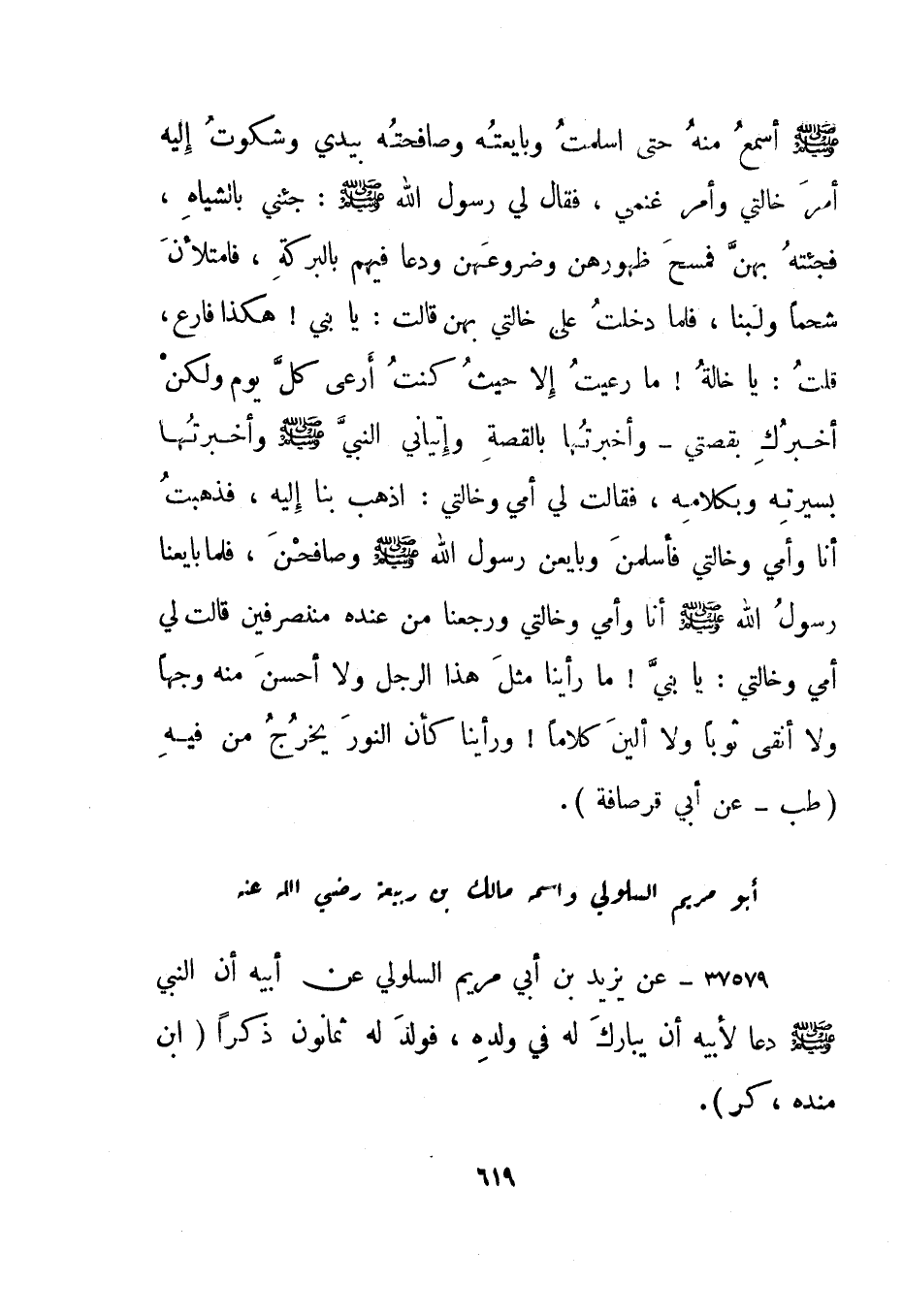 37582- عن يزيد بن أبي مريم السلولي عن أبيه أن النبي صلى الله عليه وسلم دعا لأبيه أن يبارك له في ولده، فولد له ثمانون ذكرا."ابن منده، كر".